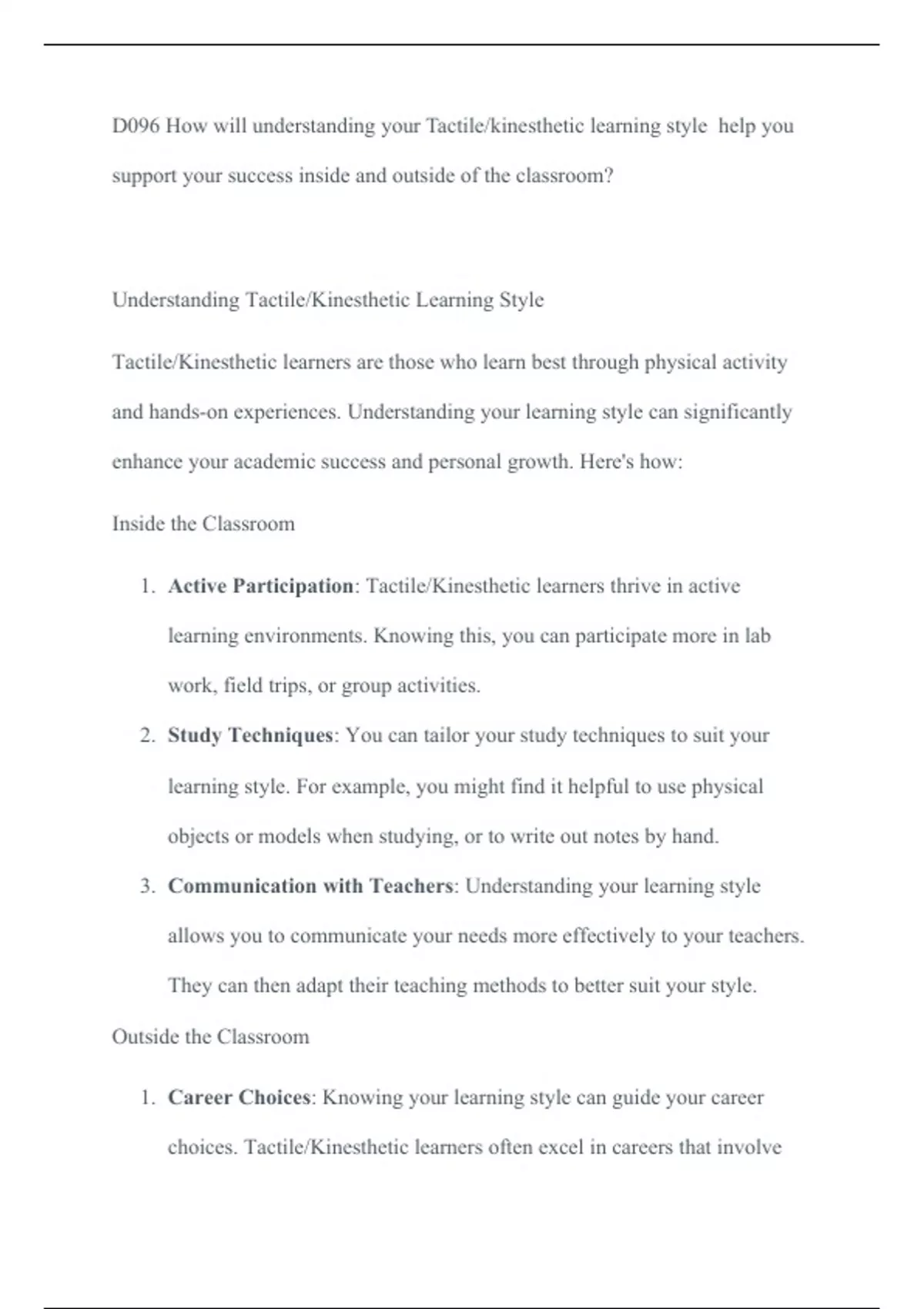 D096 How will understanding your Tactile/kinesthetic learning style help you support your D096 How will understanding your Tactile/kinesthetic learning style help you support your success inside and outside of the classroom? Understanding Tactile/Kinesthetic Learning Style Tactile/Kinesthetic learners are those who learn best through physical activity and hands-on experiences. Understanding your learning style can significantly enhance your academic success and personal growth. Here's how: Inside the Classroom 1.Active Participation: Tactile/Kinesthetic learners thrive in active learning environments. Knowing this, you can participate more in lab work, field trips, or group activities. 2.Study Techniques: You can tailor your study techniques to suit your learning style. For example, you might find it helpful to use physical objects or models when studying, or to write out notes by hand. 3.Communication with Teachers: Understanding your learning style allows you to comm