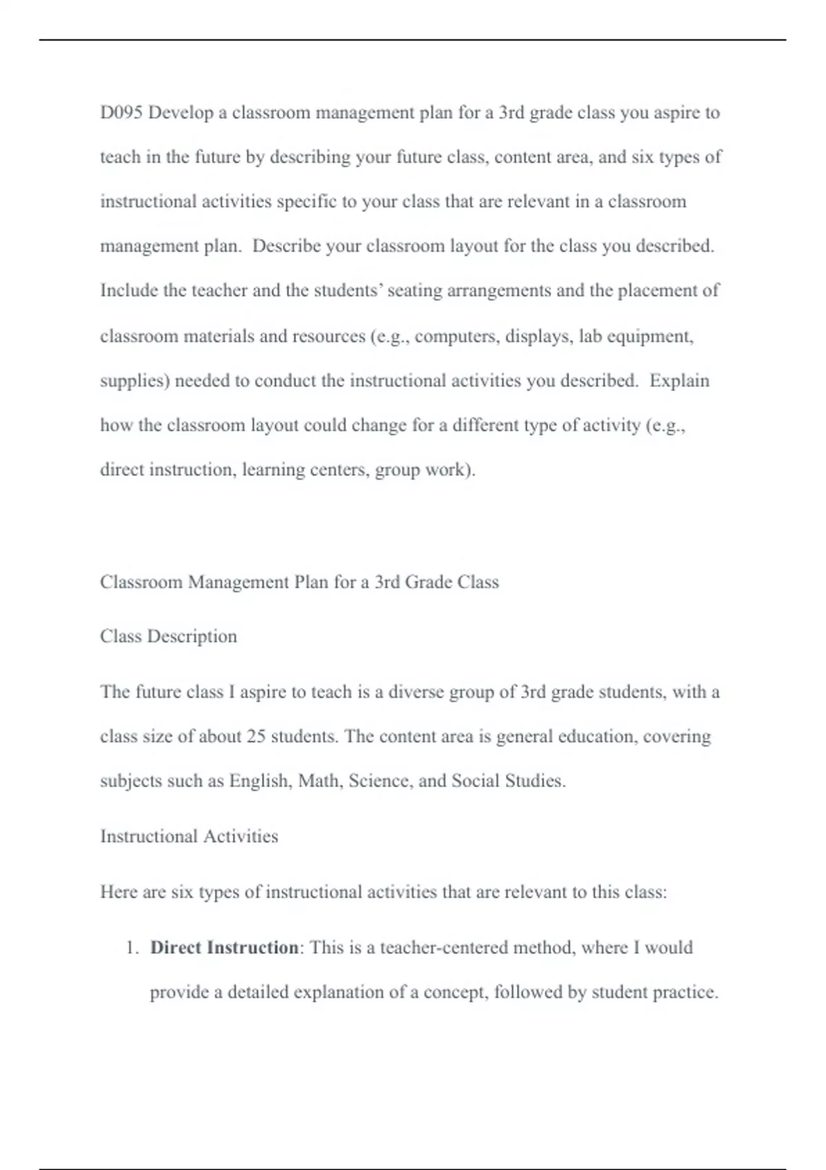 D095 Develop a classroom management plan for a 3rd grade class you aspire to teach in the D095 Develop a classroom management plan for a 3rd grade class you aspire to teach in the future by describing your future class, content area, and six types of instructional activities specific to your class that are relevant in a classroom management plan. Describe your classroom layout for the class you described. Include the teacher and the students€™ seating arrangements and the placement of classroom materials and resources (e.g., computers, displays, lab equipment, supplies) needed to conduct the instructional activities you described. Explain how the classroom layout could change for a different type of activity (e.g., direct instruction, learning centers, group work). Classroom Management Plan for a 3rd Grade Class Class Description The future class I aspire to teach is a diverse group of 3rd grade students, with a class size of about 25 students. The content area is genera