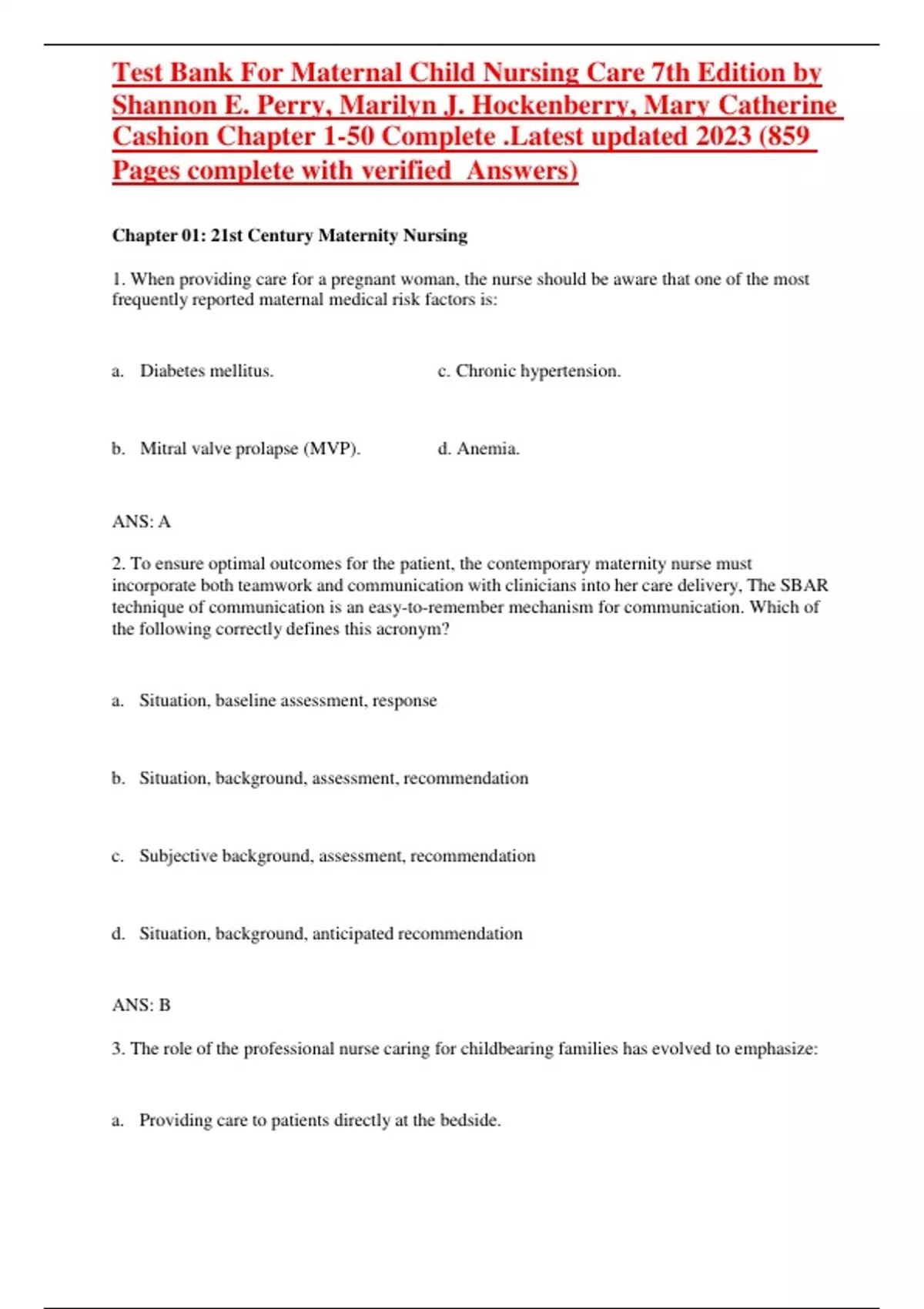 Test Bank For Maternal Child Nursing Care 7th Edition by Shannon E. Perry, Marilyn J. Hockenberry, Mary Catherine Cashion - Chapter 1 to 50 - COMPLETE A+ GUIDE