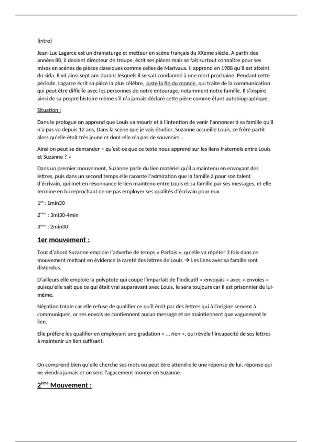 Fiche de révision pour l'oral du Bac de Français, Juste la fin du Monde : Première Partie scène 3, "Parfois, tu nous envoyais des lettres", Jean Luc Lagarce