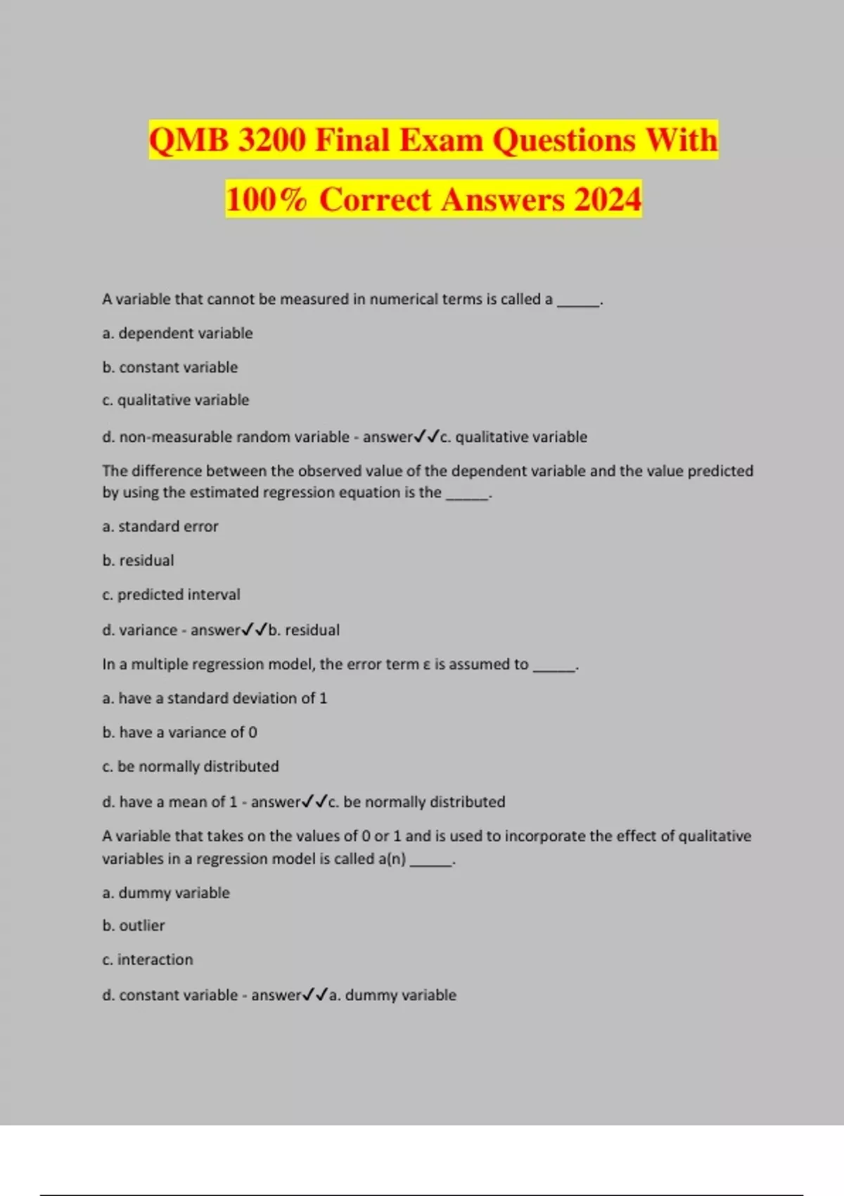 QMB 3200 Final Exam Questions With 100% Correct Answers 2024 A variable that cannot be measured in numerical terms is called a _____. a. dependent variable b. constant variable c. qualitative variable d. non-measurable random variable - answerc. qualitative variable The difference between the observed value of the dependent variable and the value predicted by using the estimated regression equation is the _____. a. standard error b. residual c. predicted interval d. variance - answerb. residual In a multiple regression model, the error term ε is assumed to _____. a. have a standard deviation of 1 b. have a variance of 0 c. be normally distributed d. have a mean of 1 - answerc. be normally distributed A variable that takes on the values of 0 or 1 and is used to incorporate the effect of qualitative variables in a regression model is called a(n) _____. a. dummy variable b. outlier c. interaction d. constant variable - answera. dummy variable A term used to describe the case when the independent variables in a multiple regression model are correlated is _____. a. correlation b. multicollinearity c. regression d. linearity - answerb. multicollinearity In regression analysis, an outlier is an observation whose _____. a. mean is larger than the standard deviation b. mean is 0 c. residual is 0 d. residual is much larger than the rest of the residual values - answerd. residual is much larger than the rest of the residual values In a multiple regression model, the error term ε is assumed to be a random variable with a mean of _____. a. 0 b. 1 c. any value d. −1 - answera. 0 Exhibit 15-4 a. y = β0 + β1x1 + β2x2 + ε b. E(y) = β0 + β1x1 c. ŷ = b0 + b1 x1 + b2 x2 d. E(y) = β0 + β1x1 + β2x2 Which equation describes the multiple regression model? a. equation d b. equation b c. equation a d. equation c - answerc. equation a In a multiple regression model, the values of the error term, ε, are assumed to be _____. a. independent of each other b. dependent on each other c. 0 d. always negative - answera. independent of each other A measure of goodness of fit for the estimated regression equation is the _____. a. sample size b. mean square due to error c. multiple coefficient of determination d. mean square due to regression - answerc. multiple coefficient of determination Exhibit 15-4 a. y = β0 + β1x1 + β2x2 + ε b. E(y) = β0 + β1x1 c. ŷ = b0 + b1 x1 + b2 x2 d. E(y) = β0 + β1x1 + β2x2 Which equation describes the multiple regression equation? a. equation a b. equation b c. equation c d. equation d - answerd. equation d As the goodness of fit for the estimated multiple regression equation increases, _____. a. the value of the regression equation's constant b0 decreases b. the value of the correlation coefficient increases c. the value of the multiple coefficient of determination increases d. the value of the adjusted multiple coefficient of determination decreases - answerc. the value of the multiple coefficient of determination increases In multiple regression analysis, the correlation among the independent variables is termed _____. a. adjusted coefficient of determination b. multicollinearity c. linearity d. collinearity - answerb. multicollinearity The adjusted multiple coefficient of determination is adjusted for _____. a. the number of independent variables b. the number of equations c. detrimental situations d. the number of dependent variables - answera. the number of independent variables In regression analysis, the response variable is the _____. a. slope of the regression function b. intercept c. independent variable d. dependent variable - answerd. dependent variable Exhibit 15-4 a. y = β0 + β1x1 + β2x2 + ε b. E(y) = β0 + β1x1 c. ŷ = b0 + b1 x1 + b2 x2 d. E(y) = β0 + β1x1 + β2x2 Which equation gives the estimated regression line? a. equation c b. equation d c. equation a