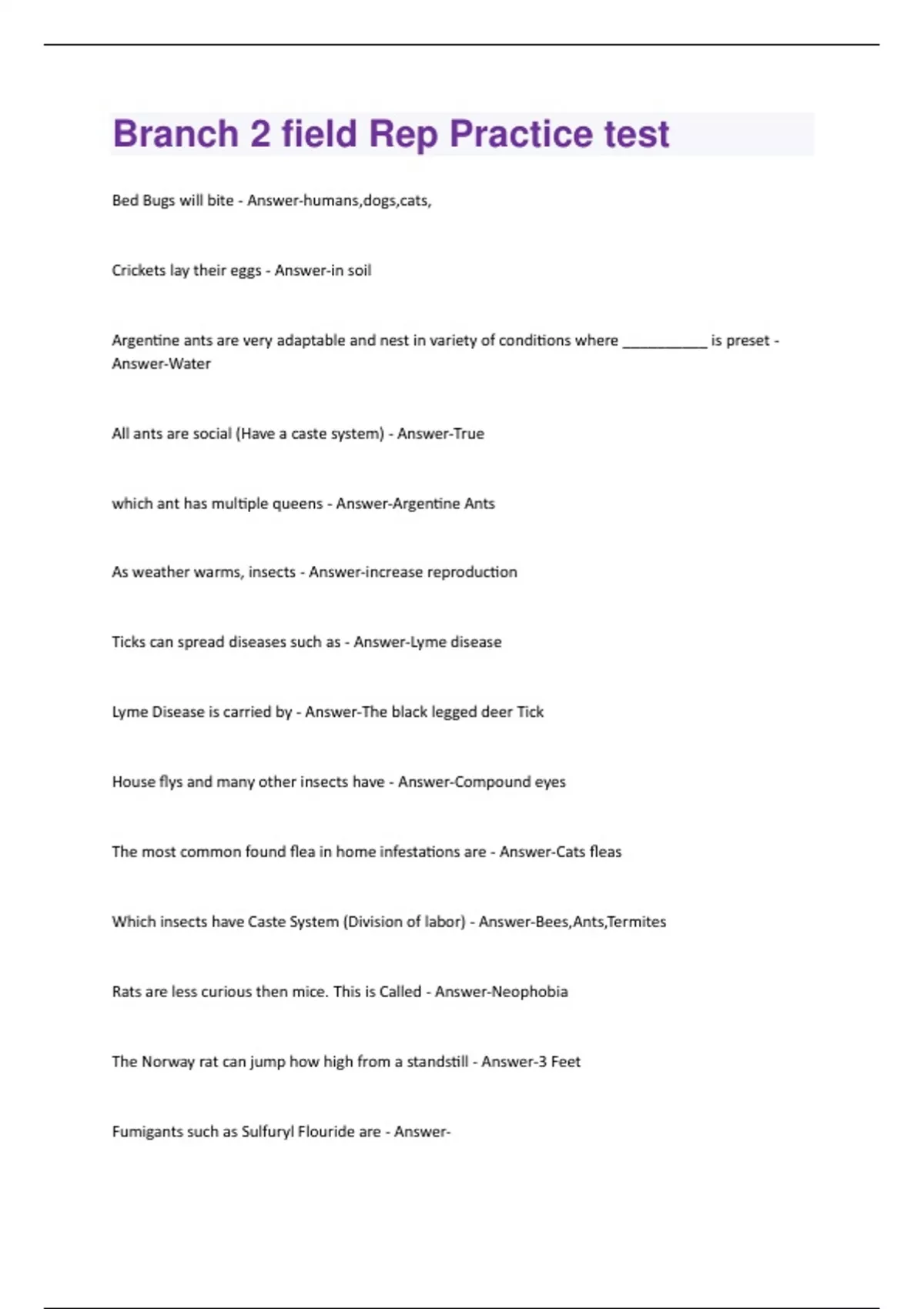 Bed Bugs will bite - Answer-humans,dogs,cats, Crickets lay their eggs - Answer-in soil Argentine ants are very adaptable and nest in variety of conditions where __________ is preset - Answer-Water All ants are social (Have a caste system) - Answer-True which ant has multiple queens - Answer-Argentine Ants As weather warms, insects - Answer-increase reproduction Ticks can spread diseases such as - Answer-Lyme disease Lyme Disease is carried by - Answer-The black legged deer Tick House flys and many other insects have - Answer-Compound eyes The most common found flea in home infestations are - Answer-Cats fleas Which insects have Caste System (Division of labor) - Answer-Bees,Ants,Termites Rats are less curious then mice. This is Called - Answer-Neophobia The Norway rat can jump how high from a standstill - Answer-3 Feet Fumigants such as Sulfuryl Flouride are - Answerwhich bird is sometimes considered a pest bird in California - Answer-Robin Scorpions are related to - Answer-Ticks,mites,spiders due to them both having exoskeletons Black widows make what type of web - Answer-unkempt disorganized with "scaffold' webbing Cloth moths - Answer-Are not strong flyers and are not attracted to light Fabric pests are looking to ingest woolens an silk to digest what - Answer-Keratin