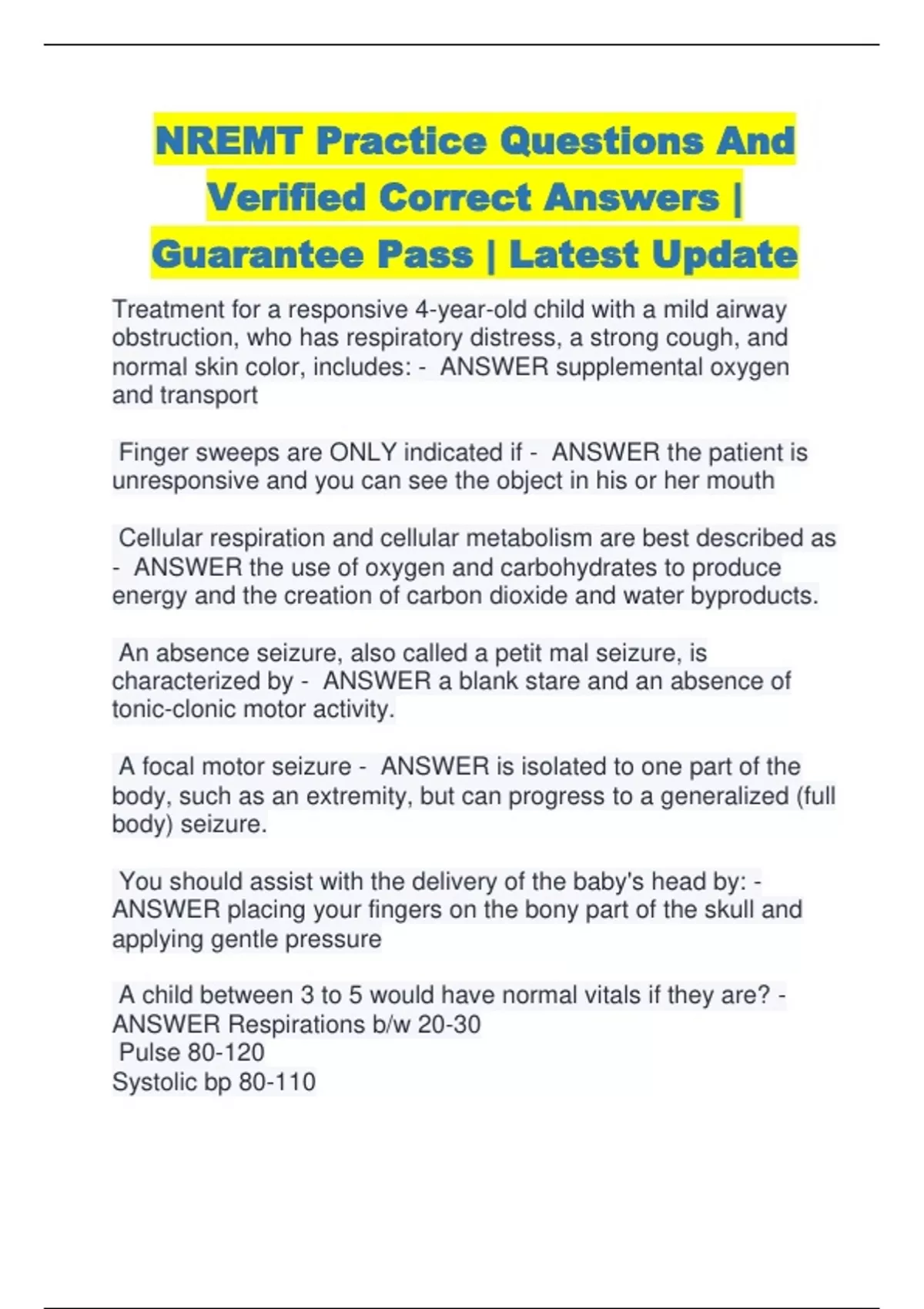 NREMT Practice Questions And Verified Correct Answers | Guarantee Pass | Latest Update Treatment for a responsive 4-year-old child with a mild airway obstruction, who has respiratory distress, a strong cough, and normal skin color, includes: - ANSWER supplemental oxygen and transport Finger sweeps are ONLY indicated if - ANSWER the patient is unresponsive and you can see the object in his or her mouth Cellular respiration and cellular metabolism are best described as - ANSWER the use of oxygen and carbohydrates to produce energy and the creation of carbon dioxide and water byproducts. An absence seizure, also called a petit mal seizure, is characterized by - ANSWER a blank stare and an absence of tonic-clonic motor activity. A focal motor seizure - ANSWER is isolated to one part of the body, such as an extremity, but can progress to a generalized (full body) seizure. You should assist with the delivery of the baby's head by: - ANSWER placing your fingers on the bony part of the skull and applying gentle pressure A child between 3 to 5 would have normal vitals if they are? - ANSWER Respirations b/w 20-30 Pulse 80-120 Systolic bp 80-110
