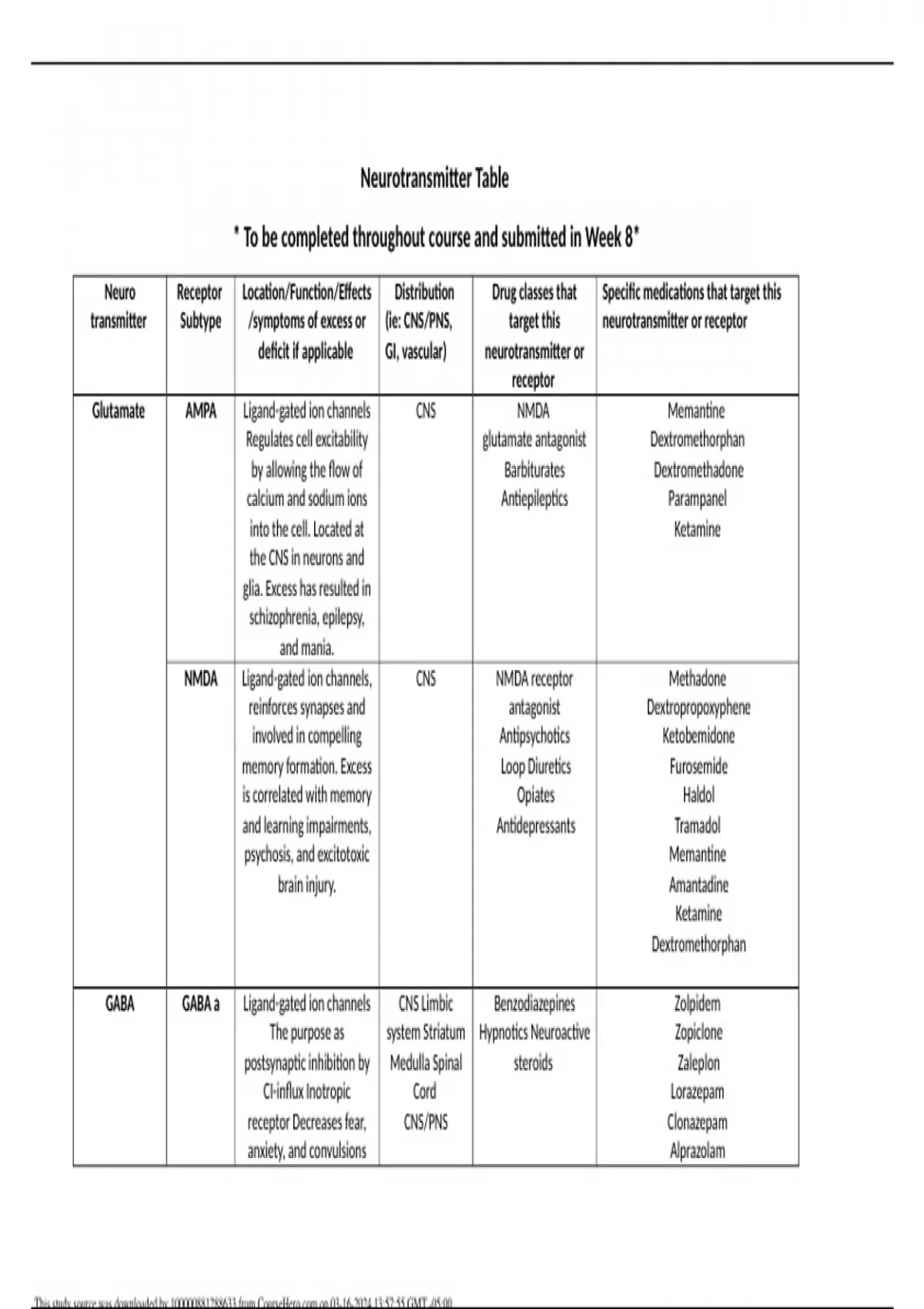 Neurotransmitter Table * To be completed throughout course and submitted in Week 8* Neuro transmitter Receptor Subtype Location/Function/Effects /symptoms of excess or deficit if applicable Distribution (ie: CNS/PNS, GI, vascular) Drug classes that target this neurotransmitter or receptor Specific medication