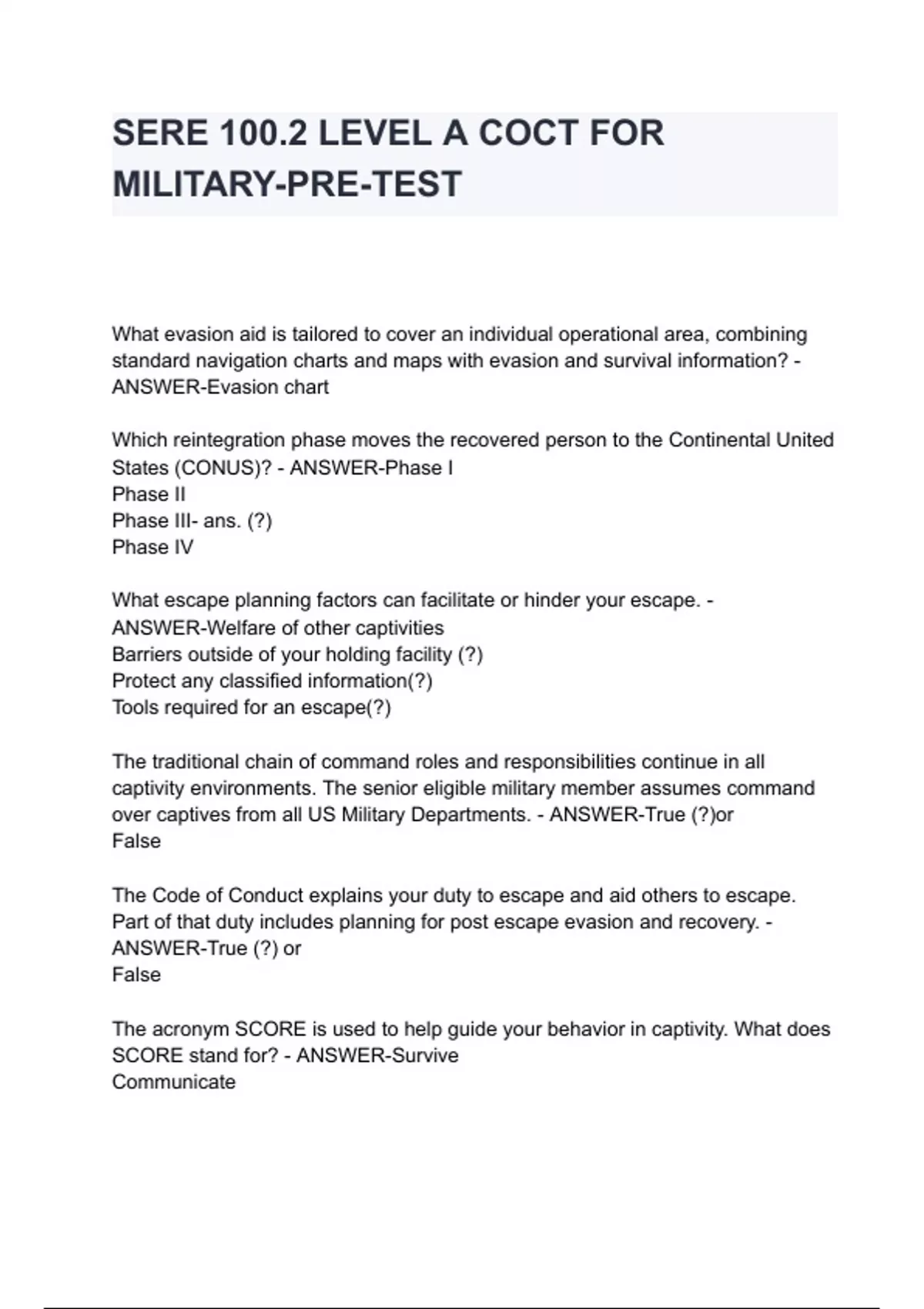 SERE 100.2 LEVEL A COCT FOR MILITARY-PRE-TEST