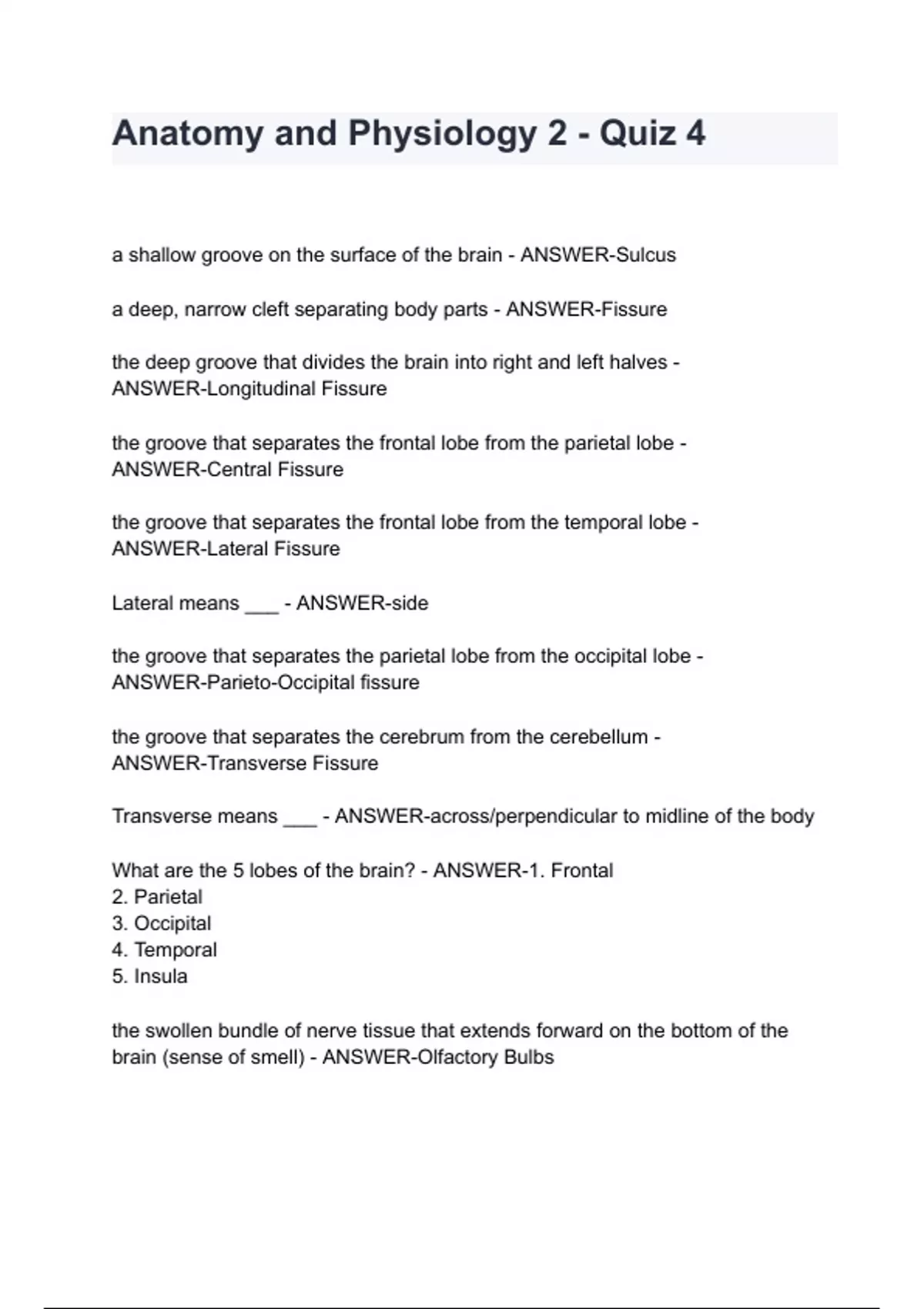 a shallow groove on the surface of the brain - ANSWER-Sulcus a deep, narrow cleft separating body parts - ANSWER-Fissure the deep groove that divides the brain into right and left halves - ANSWER-Longitudinal Fissure the groove that separates the frontal lobe from the parietal lobe - ANSWER-Central Fissure the groove that separates the frontal lobe from the temporal lobe - ANSWER-Lateral Fissure Lateral means ___ - ANSWER-side the groove that separates the parietal lobe from the occipital lobe - ANSWER-Parieto-Occipital fissure the groove that separates the cerebrum from the cerebellum - ANSWER-Transverse Fissure Transverse m