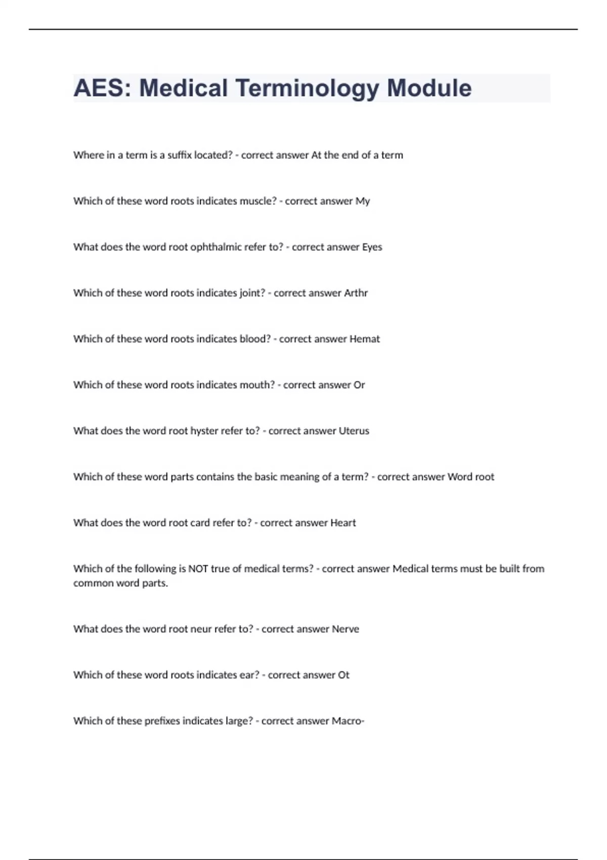 AES Medical Terminology Module Complete Test Quiz 2024. Where in a term is a suffix located? - correct answer At the end of a term Which of these word roots indicates muscle? - correct answer My What does the word root ophthalmic refer to? - correct answer Eyes Which of these word roots indicates joint? - correct answer Arthr Which of these word roots indicates blood? - correct answer Hemat Which of these word roots indicates mouth? - correct answer Or What does the word root hyster refer to? - correct answer Uterus Which of these word parts contains the basic meaning of a term? - correct answer Word root