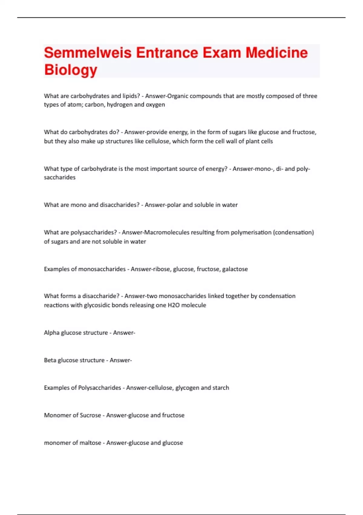 What are carbohydrates and lipids? - Answer-Organic compounds that are mostly composed of three types of atom; carbon, hydrogen and oxygen What do carbohydrates do? - Answer-provide energy, in the form of sugars like glucose and fructose, but they also make up structures like cellulose, which form the cell wall of plant cells What type of carbohydrate is the most important source of energy? - Answer-mono-, di- and polysaccharides What are mono and disaccharides? - Answer-polar and soluble in water What are polysaccharides? - Answer-Macromolecules resulting from polymerisation (condensation) of sugars and are not soluble in water Examples of monosaccharides - Answer-ribose, glucose, fructose, galactose What forms a disaccharide? - Answer-two monosaccharides linked together by condensation reactions with glycosidic bonds releasing one H2O molecule Alpha glucose structure - AnswerBeta glucose structure - AnswerExamples of Polysaccharides - Answer-cellulose, glycogen and starch Monomer of Sucrose - Answer-glucose and fructose monomer of maltose - Answer-glucose and glucosemonomer of lactose - Answer-glucose and galactose monomer of starch - Answer-glucose monomer of glycogen - Answer-glucose monomer of cellulose - Answer-glucose In animals, what carbohydrate stores energy? - Answer-glycogen