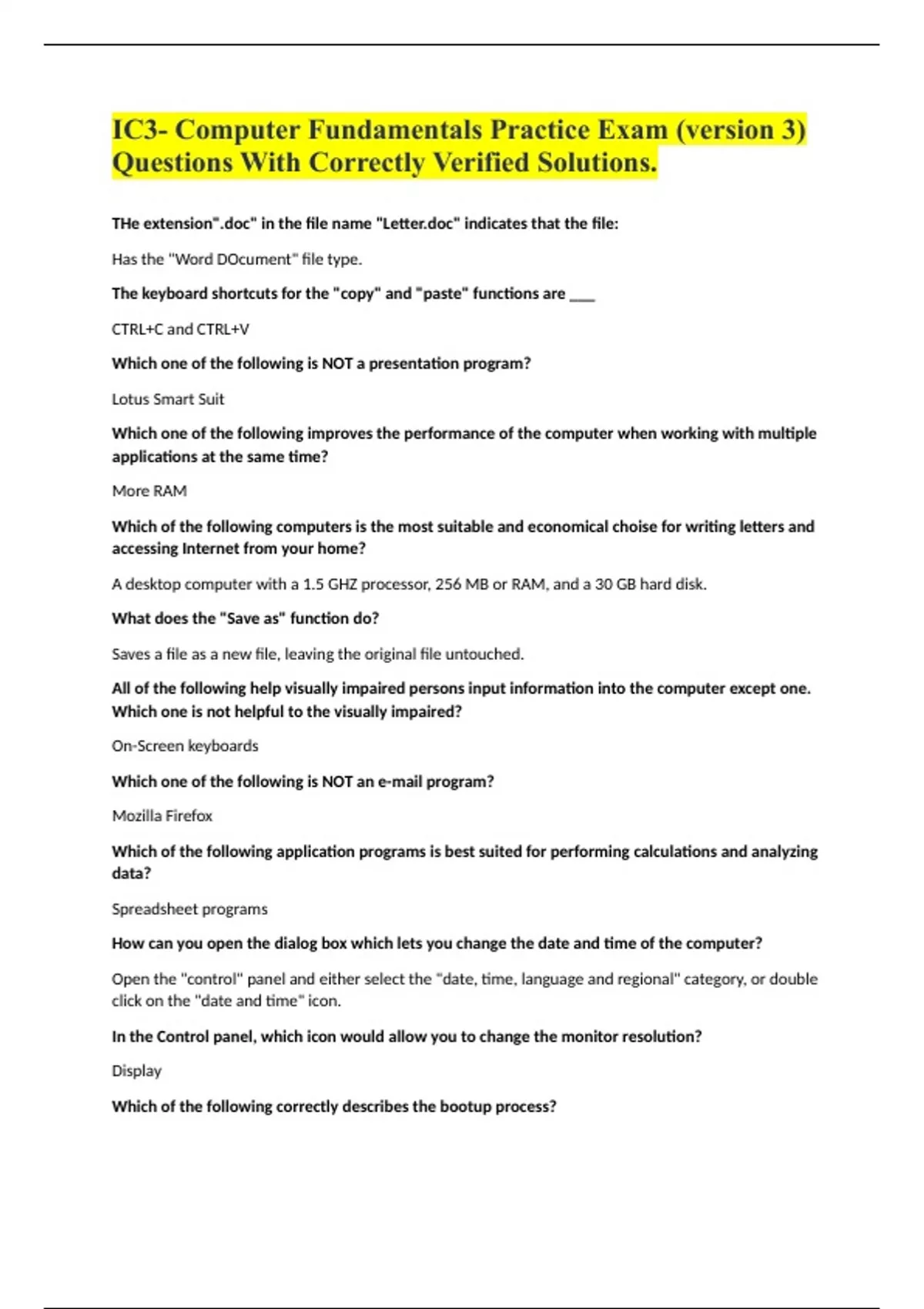 IC3- Computer Fundamentals Practice Exam (version 3) Questions With Correctly Verified Solutions.