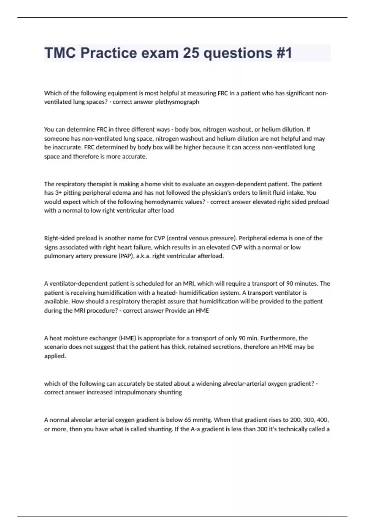 TMC Practice Exam 25 Questions 1 Clearly Answered 2024. Which of the following equipment is most helpful at measuring FRC in a patient who has significant non-ventilated lung spaces? - correct answer plethysmograph You can determine FRC in three different ways - body box, nitrogen washout, or helium dilution. If someone has non-ventilated lung space, nitrogen washout and helium dilution are not helpful and may be inaccurate. FRC determined by body box will be higher because it can access non-ventilated lung space and therefore is more accurate. The respiratory therapist is making a home visit to evaluate an oxygen-dependent patient. The patient has 3+ pitting peripheral edema and has not followed the physician's orders to limit fluid intake. You would expect which of the following hemodynamic values? - correct answer elevated right sided preload with a normal to low right ventricular after load Right-sided preload is another name for CVP (central venous pressure). Peripheral edema is one of the signs associated with right heart failure, which results in an elevated CVP with a normal or low pulmonary artery pressure (PAP), a.k.a. right ventricular afterload. A ventilator-dependent patient is scheduled for an MRI, which will require a transport of 90 minutes. The patient is receiving humidification with a heated- humidification system. A transport ventilator is available. How should a respiratory therapist assure that humidification will be provided to the patient during the MRI procedure? - correct answer Provide an HME A heat moisture exchanger (HME) is appropriate for a transport of only 90 min. Furthermore, the scenario does not suggest that the patient has thick, retained secretions, therefore an HME may be applied. which of the following can accurately be stated about a widening alveolar-arterial oxygen gradient? - correct answer increased intrapulmonary shunting A normal alveolar arterial oxygen gradient is below 65 mmHg. When that gradient rises to 200, 300, 400, or more, then you have what is called shunting. If the A-a gradient is less than 300 it's technically called a