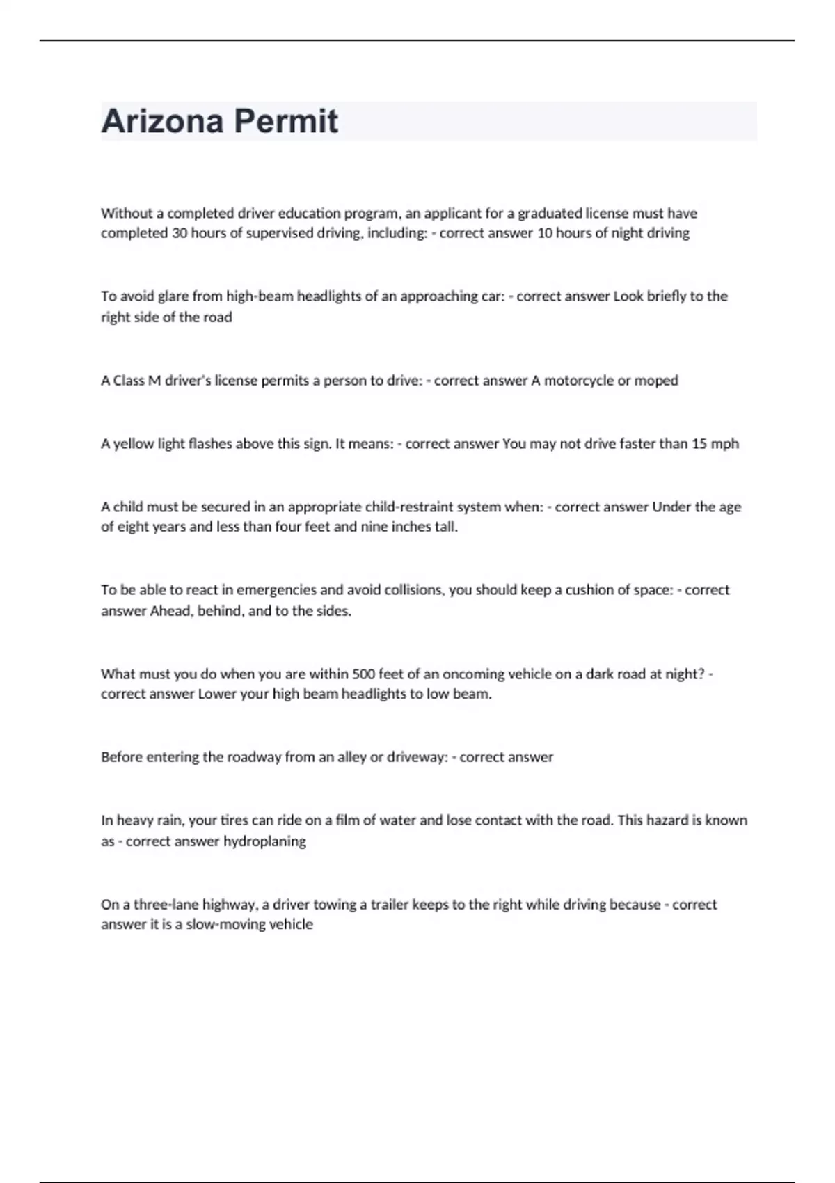 Arizona Permit Question and answers correctly solved 2024 Without a completed driver education program, an applicant for a graduated license must have completed 30 hours of supervised driving, including: - correct answer 10 hours of night driving To avoid glare from high-beam headlights of an approaching car: - correct answer Look briefly to the right side of the road A Class M driver's license permits a person to drive: - correct answer A motorcycle or moped A yellow light flashes above this sign. It means: - correct answer You may not drive faster than 15 mph A child must be secured in an appropriate child-restraint system when: - correct answer Under the age of eight years and less than four feet and nine inches tall. To be able to react in emergencies and avoid collisions, you should keep a cushion of space: - correct answer Ahead, behind, and to the sides. What must you do when you are within 500 feet of an oncoming vehicle on a dark road at night? - correct answer Lower your high beam headlights to low beam.