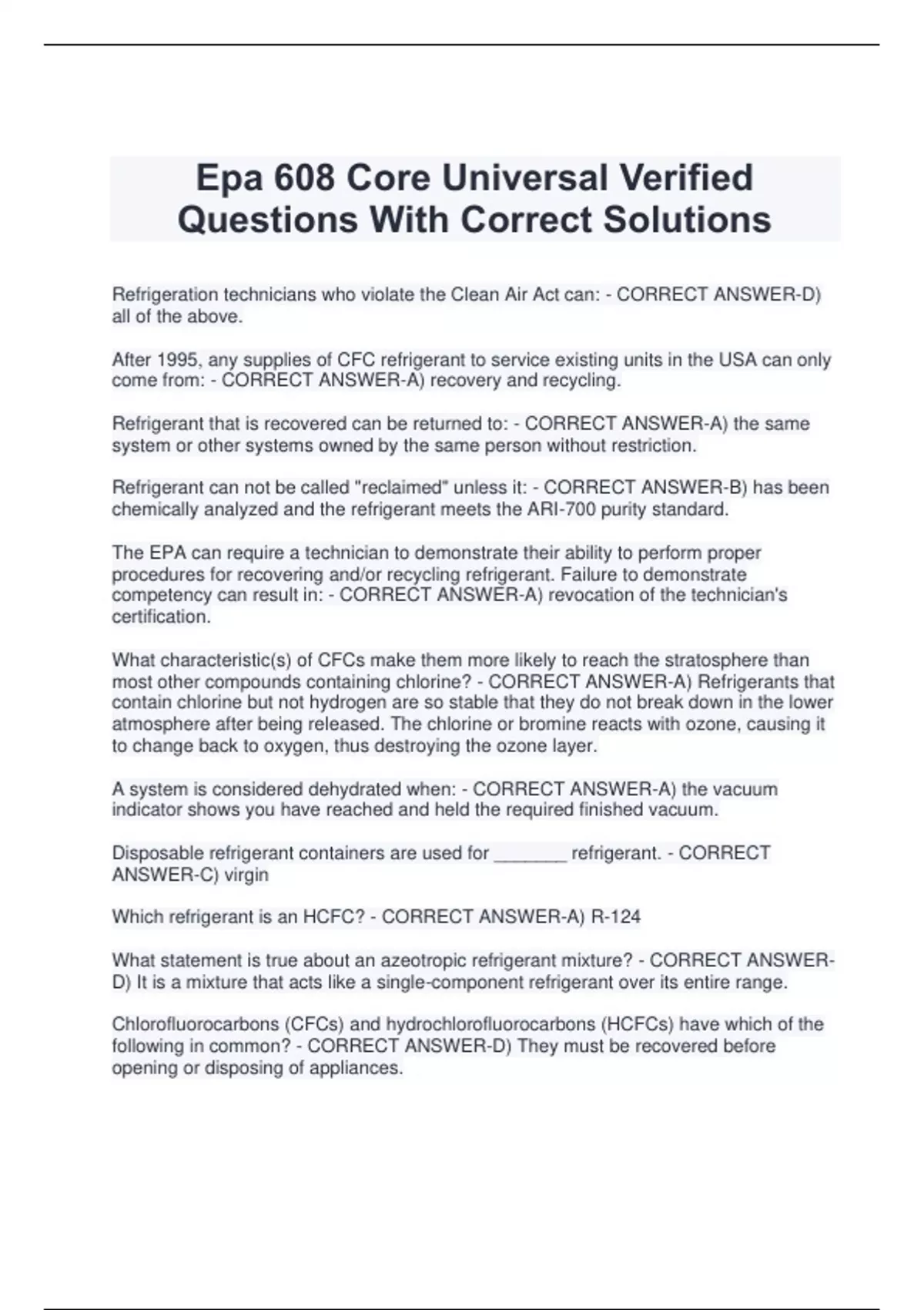 Epa 608 Core Universal Verified Questions With Correct Solutions Refrigeration technicians who violate the Clean Air Act can: - CORRECT ANSWER-D) all of the above. After 1995, any supplies of CFC refrigerant to service existing units in the USA can only come from: - CORRECT ANSWER-A) recovery and recycling. Refrigerant that is recovered can be returned to: - CORRECT ANSWER-A) the same system or other systems owned by the same person without restriction. Refrigerant can not be called "reclaimed" unless it: - CORRECT ANSWER-B) has been chemically analyzed and the refrigerant meets the ARI-700 purity standard. The EPA can require a technician to demonstrate their ability to perform proper procedures for recovering and/or recycling refrigerant. Failure to demonstrate competency can result in: - CORRECT ANSWER-A) revocation of the technician's certification. What characteristic(s) of CFCs make them more likely to reach the stratosphere than most other compounds containing chlorine? - CORRECT ANSWER-A) Refrigerants that contain chlorine but not hydrogen are so stable that they do not break down in the lower atmosphere after being released. The chlorine or bromine reacts with ozone, causing it to change back to oxygen, thus destroying the ozone layer. A system is considered dehydrated when: - CORRECT ANSWER-A) the vacuum indicator shows you have reached and held the required finished vacuum. Disposable refrigerant containers are used for _______ refrigerant. - CORRECT ANSWER-C) virgin Which refrigerant is an HCFC? - CORRECT ANSWER-A) R-124 What statement is true about an azeotropic refrigerant mixture? - CORRECT ANSWERD) It is a mixture that acts like a single-component refrigerant over its entire range. Chlorofluorocarbons (CFCs) and hydrochlorofluorocarbons (HCFCs) have which of the following in common? - CORRECT ANSWER-D) They must be recovered before opening or disposing of appliances