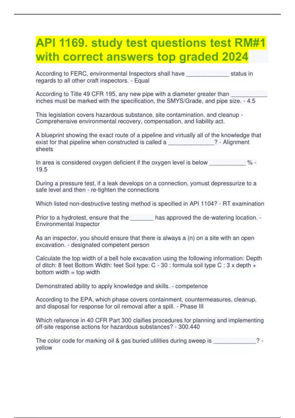 According to FERC, environmental Inspectors shall have _____________ status in regards to all other craft inspectors. - Equal According to Title 49 CFR 195, any new pipe with a diameter greater than ___________ inches must be marked with the specification, the SMYS/Grade, and pipe size. - 4.5 This legislation covers hazardous substance, site contamination, and cleanup - Comprehensive environmental recovery, compensation, and liability act. A blueprint showing the exact route of a pipeline and virtually all of the knowledge that exist for that pipeline when constructed is called a ______________? - Alignment sheets In area is considered oxygen deficient if the oxygen level is below ___________ % - 19.5 During a pressure test, if a leak develops on a connection, yomust depressurize to a safe level and then - re-tighten the connections Which listed non-destructive testing method is specified in API 1104? - RT examination Prior to a hydrotest, ensure that the _______ has approved the de-watering location. - Environmental Inspector As an inspector, you should ensure that there is always a (n) on a site with an open excavation. - designated competent person Calculate the top width of a bell hole excavation using the following information: Depth of ditch: 8 feet Bottom Width: feet Soil type: C - 30 : formula soil type C : 3 x depth + bottom width = top width Demonstrated ability to apply knowledge and skills. - competence According to the EPA, which phase covers containment, countermeasures, cleanup, and disposal for response for oil removal after a spill. - Phase III Which refarence in 40 CFR Part 300 claifies procedures for planning and implementing off-site response actions for hazardous substances? - 300.440 The color code for marking oil & gas buried utilities during sweep is _____________? - yellow According to OSHA, excavations that are less than 5' in depth & the examination of the ground by a competent person provides no indication of a potential cave-in, is not required to have any type of protection system. - True MOC stands for ____________? - management of change Replica tape is used during __________ measurements? - surface profile Where can the exact code for strength test requirements be found for carbon steel (natural gas) pipelines to operate at a hoop stress of 30% or more of SMYS? - 192.505 Title 49, CFR 195: The total number of girth welds and the number nondestructively tested, including the number rejected and the disposition of each rejected weld records must be maintained for at least - 5 years According to Title 49, CFR 192, Subpart N: Records of prior qualification and records of individuals no longer performing covered tasks shall be retained for a period of ______________ years. - 5 During weld qualification, the fillet weld specimens can be broken inside the weld by any convenient method. - true The excavation tolerance zone is __________from center-line of proposed excavation. The excavation. - 24 inchs Typically, the test pressure ratio is 1.25 and the duration is 4 hours or longer during __________? - strength test In recards to hazardous liquids pipelines, what is the API RP that must be followed in order to use pipe transported via railroad if it has an OD to WT ratio of 75 to 1 and that will be operated at a hoop stress of 25% of SMYS? - API RP SL1 According to OSHA, what is the maximum amount of Category 4 flammable liquids that may be stored in any one Storage cabinet? - 120 gallons The encroachment area is an area within ________________ of the existing facilities, or the distant mandated by state law where applicable, which ever is greater. - 50 feet The three main systems of pipelines according to PHMSA are - Transmission, gathering, and distribution Due Diligence Corridor is distance equal to the width of the proposed survey corridor plus ___________ feet on each side for Crossings Construction involving survey corridor. - 50