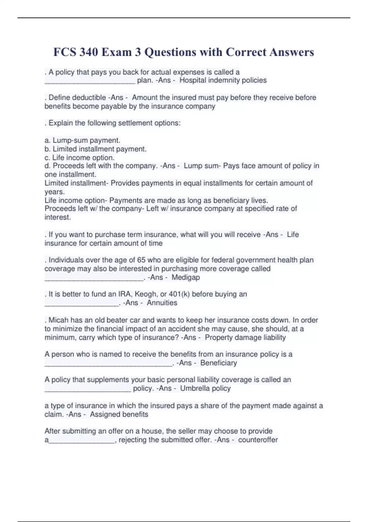 . A policy that pays you back for actual expenses is called a ______________________ plan. -Ans - Hospital indemnity policies . Define deductible -Ans - Amount the insured must pay before they receive before benefits become payable by the insurance company . Explain the following settlement options: a. Lump-sum payment. b. Limited installment payment. c. Life income option. d. Proceeds left with the company. -Ans - Lump sum- Pays face amount of policy in one installment. Limited installment- Provides payments in equal installments for certain amount of years. Life income option- Payments are made as long as beneficiary lives. Proceeds left w/ the company- Left w/ insurance company at specified rate of interest. . If you want to purchase term insurance, what will you will receive -Ans - Life insurance for certain amount of time . Individuals over the age of 65 who are eligible for federal government health plan coverage may also be interested in purchasing more coverage called ________________________. -Ans - Medigap . It is better to fund an IRA, Keogh, or 401(k) before buying an __________________. -Ans - Annuities . Micah has an old beater car and wants to keep her insurance costs down. In order to minimize the financial impact of an accident she may cause, she should, at a minimum, carry which type of insurance? -Ans - Property damage liability A person who is named to receive the benefits from an insurance policy is a _______________________________. -Ans - Beneficiary A policy that supplements your basic personal liability coverage is called an _____________________ policy. -Ans - Umbrella policy a type of insurance in which the insured pays a share of the payment made against a claim. -Ans - Assigned benefits After submitting an offer on a house, the seller may choose to provide a________________, rejecting the submitted offer. -Ans - counteroffe