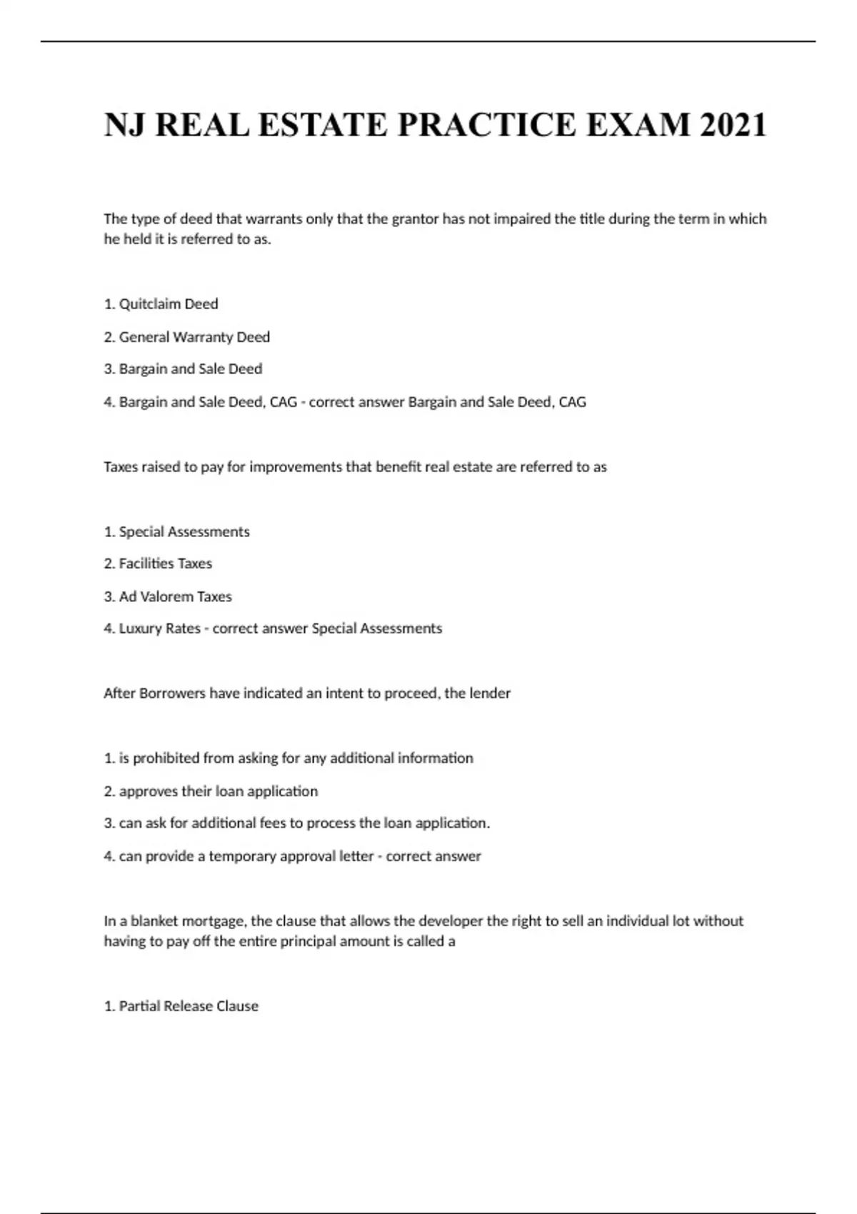 NJ REAL ESTATE PRACTICE EXAM QUESTIONS & ANSWERS GUIDE 2024. The type of deed that warrants only that the grantor has not impaired the title during the term in which he held it is referred to as. 1. Quitclaim Deed 2. General Warranty Deed 3. Bargain and Sale Deed 4. Bargain and Sale Deed, CAG - correct answer Bargain and Sale Deed, CAG Taxes raised to pay for improvements that benefit real estate are referred to as 1. Special Assessments 2. Facilities Taxes 3. Ad Valorem Taxes 4. Luxury Rates - correct answer Special Assessments After Borrowers have indicated an intent to proceed, the lender 1. is prohibited from asking for any additional information 2. approves their loan application 3. can ask for additional fees to process the loan application. 4. can provide a temporary approval letter - correct answer In a blanket mortgage, the clause that allows the developer the right to sell an individual lot without having to pay off the entire principal amount is called a