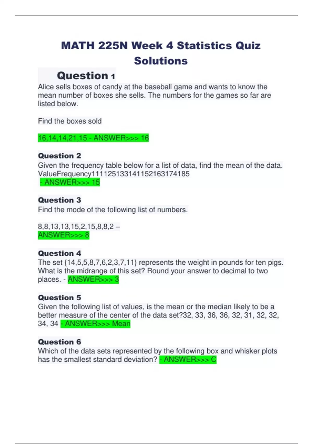 MATH 225N Week 4 Statistics Quiz (Version 1) 1. Question: Alice sells boxes of candy at the baseball game and wants to know the mean number of boxes she sells. The numbers for the games so far are ……. 16,14,14,21,15 2. Question: Given the following list of prices (in thousands of dollars) of randomly selected trucks at a car dealership, find the median…… 20,46,19,14,42,26,33 3. Question: Each person in a group shuffles a deck of cards and keeps selecting a card until a queen appears. Find the mode of the following number of cards drawn from a deck until a queen appears……. 3,12,3,11,5,5,3,10,12 4. Question: The dataset below represents bugs found by a software tester in her product during different phases of testing:….. 88, 84, 81, 94, 91, 98, 98, 200. The measures of central tendency are … below: Mean: 25; Median: 92.5; Mode: 98. Identify the outlier and the measure of central tendency that is … by the outlier. 5. Question: Given the following histogram, decide if the data is … or symmetrical……. A bar graph has a horizontal axis titled Values labeled from 2 to 18 in increments of 2 and a vertical axis titled Frequency labeled from 0 to 200 in increments of 50. 14 bars are plotted, above the numbers 2 to 16. From left to right, the heights of the bars are as follows: 1. 5. 10. 40, 75, 125, 190, 180, 130, 125, 60, 25,20, 10. All values are approximate. 6. Question: The following data set represents the ages of all seven grandchildren in a family……. 4, 5, 11, 12, 11, 8, 5 If the variance of the ages is 7, what is the standard deviation? Round the final answer to one decimal place. 7. Question: Which of the data sets represented by the following box and whisker plots has the smallest standard deviation?……. Four horizontal box-and-whisker plots share a vertical axis with the classes D, C, B, and A and a horizontal axis from 0 to 120 in increments of 20. The box-and-whisker plot above the class label A has the following five-number summary: 44, 69, 77, 82, and 112. The box-and-whisker plot above the class label B has the following five-number summary: 19, 64, 78, 87, and 121. The box-and-whisker plot above the class label C has the following five-number summary: 60, 72, 75, 80, and 92. The box-and-whisker plot above the class label D has the following five-number summary: 2, 63, 77, 92, and 138. All values are approximate. 8. Question: The box-and-whisker plot shows the number of books read by history students during the last school year…… A box and whisker plot with minimum 4, first quartile 6, median 8, third quartile 10, and maximum 15…… What is the range of the data? 9. Question: A random sample of house sizes in major city has a sample mean of x¯=1204.9sq ft and sample standard deviation of s=124.6 sq ft. Use the Empirical Rule to determine the approximate percentage of house sizes that lie between 7and 1454.1 sq ft……. Round your answer to the nearest whole number (percent). 10. Question: Is the statement below true or false?….. Independent is the property of two events in which the knowledge that one of the events occurred does not affect the chance the other occurs. 11. Question: Brayden tosses a coin 500 Of those 500times, he observes heads a total of 416 times. Calculations show that the probability of this occurring by chance is less than 0.01, assuming the coin is fair. Determine the meaning of the significance level. 12. Question: A spinner contains the numbers 1through 80. What is the probability that the spinner will land on a number that is not a multiple of 11?….. Give your answer in fraction form. 13. Question: Of the following pairs of events, which pair has mutually exclusive events? 14. Question: Fill in the following contingency table and find the number of students who both go to the beach AND go to the mountains. 15. Question: A group of 140students at an elementary school were asked if they prefer the color orange to the color green. The results are shown in the table below. Given that a randomly selected survey participant is a male, what is the probability that this student prefers the color green?…… Enter your answer as a fraction. 16. Question: Researchers want to study whether or not a fear of flying is related to a fear of heights. They surveyed a large group of people and asked them whether or not they had a fear of flying and whether or not they had a fear of heights. The data are … in the contingency table below. What is the relative risk of being afraid of heights for those who are afraid of flying? Round your answer to two decimal places. 17. Question: Which of the following frequency tables show a skewed data set? Select all answers that apply. 18. Question: A student wants to know his average homework grade for the first half of his math class. There were 7homeworks in the first half of the class, and his grades out of 100are given by….. 100,90,95,89,92,85,95…… What is the population mean of his homework grades? Round your answer to the nearest tenth. 19. Question: The following data set represents the ages of all six grandchildren in a family….. Find the variance for this data set of ages:….. 6, 3, 14, 11, 14, 6….. Round the final answer to one decimal place. 20. Question: A poll was conducted during the final game of the basketball season to determine whether fans wanted to see the defending champions win the game or the challenging team win the game. From the poll, 216of the 374residents sampled from urban areas want the defending champions to win the game. In more rural areas, 304 of the 466 residents polled want the defending champions to win the game. Assuming location has nothing to do with team preference, the probability that the data gathered was the result of chance is calculated to be 03. What is the correct interpretation of this calculation? 21. Question: Find the mode of the following amounts (in thousands of dollars) in savings accounts of randomly selected people aged 25-30