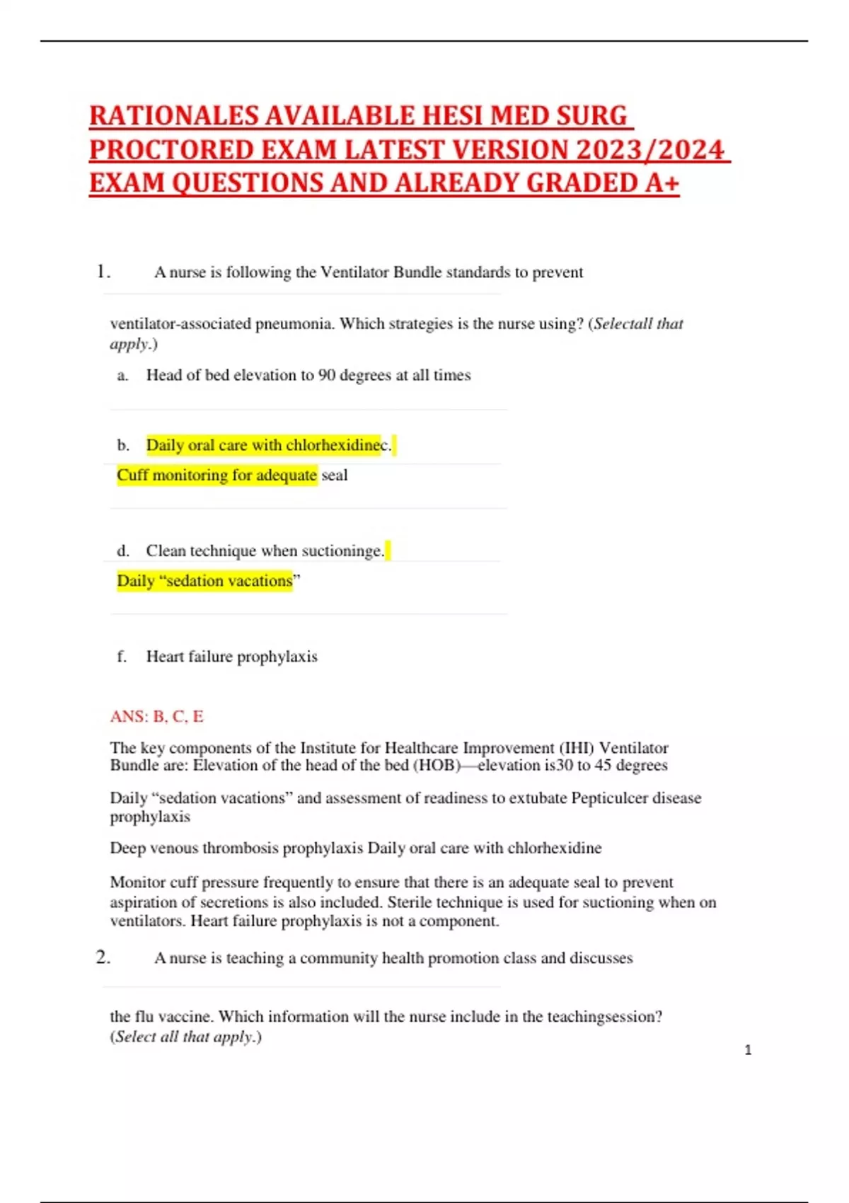 A nurse is following the Ventilator Bundle standards to prevent ventilator-associated pneumonia. Which strategies is the nurse using? (Selectall that apply.) a. Head of bed elevation to 90 degrees at all times b. Daily oral care with chlorhexidinec. Cuff monitoring for adequate seal d. Clean technique when suctioninge. Daily “sedation vacations” f. Heart failure prophylaxis ANS: B, C, E The key components of the Institute for Healthcare Improvement (IHI) Ventilator Bundle are: Elevation of the head of the bed (HOB)—elevation is30 to 45 degrees Daily “sedation vacations” and assessment of readiness to extubate Pepticulcer disease prophylaxis Deep venous thrombosis prophylaxis Daily oral care with chlorhexidine Monitor cuff pressure frequently to ensure that there is an adequate seal to prevent aspiration of secretions is also included. Sterile technique is used for suctioning when on ventilators. Heart failure prophylaxis is not a component. 2. A nurse is teaching a community health promotion class and discusses the flu vaccine. Which information will the nurse include in the teachingsession? (Select all that apply.) 2 a. It is given yearl