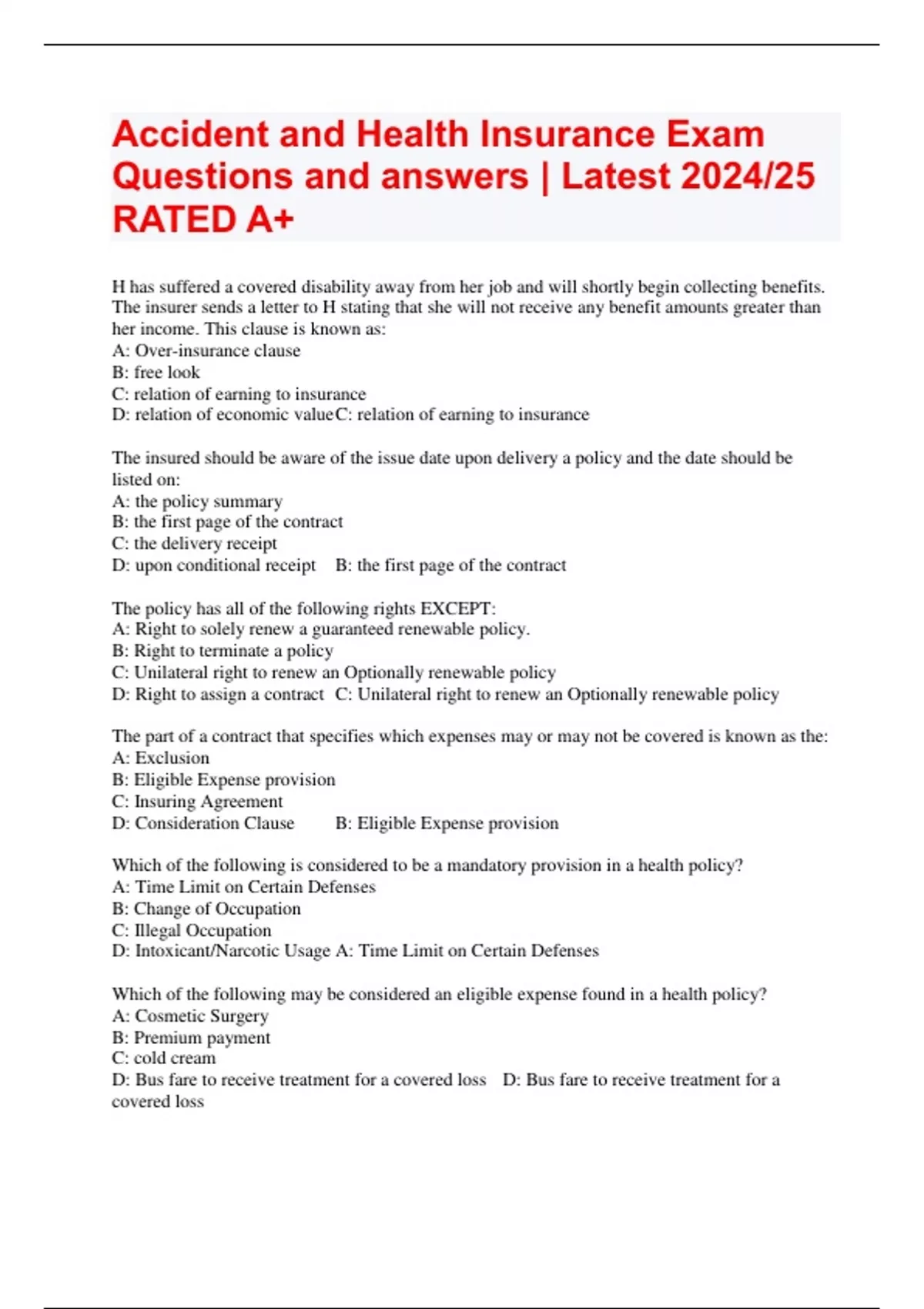 Accident and Health Insurance Exam Questions and answers | Latest 2024/25 RATED A+