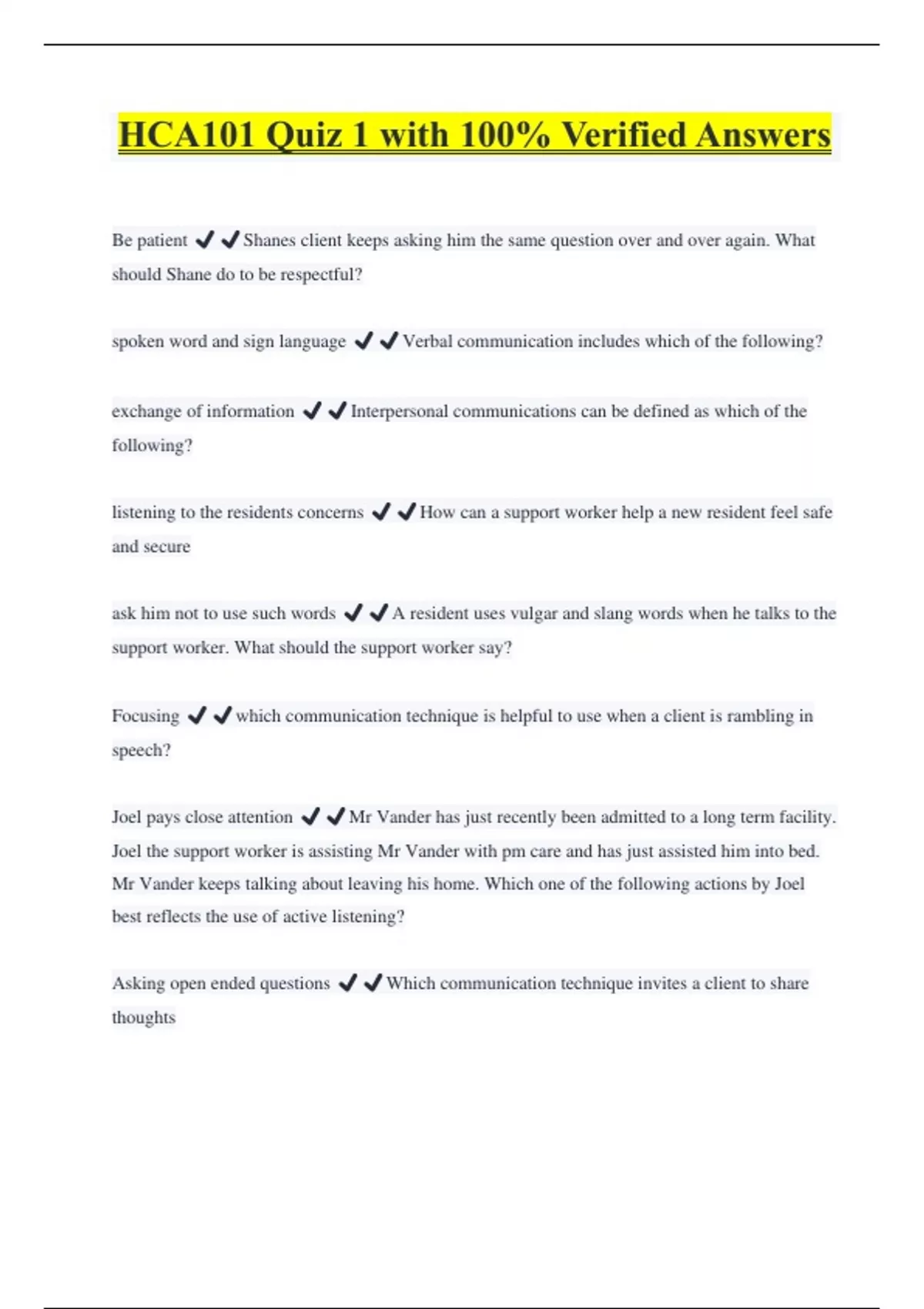HCA101 Quiz 1 with 100% Verified Answers Be patient ️️Shanes client keeps asking him the same question over and over again. What should Shane do to be respectful? spoken word and sign language ️️Verbal communication includes which of the following? exchange of information ️️Interpersonal communications can be defined as which of the following? listening to the residents concerns ️️How can a support worker help a new resident feel safe and secure ask him not to use such words ️️A resident uses vulgar and slang words when he talks to the support worker. What should the support worker say? Focusing ️️which communication technique is helpful to use when a client is rambling in speech? Joel pays close attention ️️Mr Vander has just recently been admitted to a long term facility. Joel the support worker is assisting Mr Vander with pm care and has just assisted him into bed. Mr Vander keeps talking about leaving his home. Which one of the following actions by Joel best reflects the use of active listening? Asking open ended questions ️️Which communication technique invites a client to share thoughts