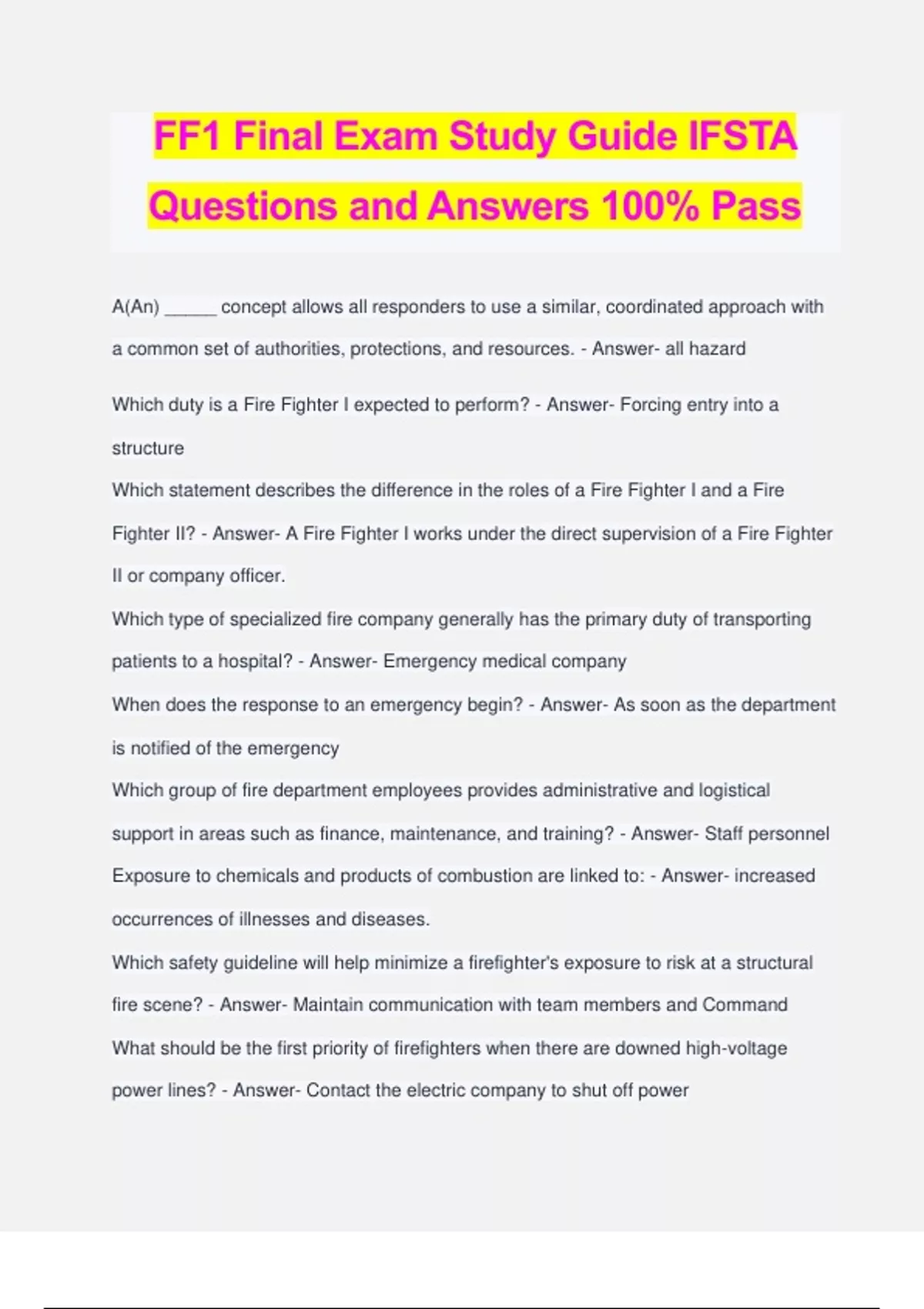 FF1 Final Exam Study Guide IFSTA Questions and Answers 100% Pass A(An) _____ concept allows all responders to use a similar, coordinated approach with a common set of authorities, protections, and resources. - Answer- all hazard Which duty is a Fire Fighter I expected to perform? - Answer- Forcing entry into a structure Which statement describes the difference in the roles of a Fire Fighter I and a Fire Fighter II? - Answer- A Fire Fighter I works under the direct supervision of a Fire Fighter II or company officer. Which type of specialized fire company generally has the primary duty of transporting patients to a hospital? - Answer- Emergency medical company When does the response to an emergency begin? - Answer- As soon as the department is notified of the emergency Which group of fire department employees provides administrative and logistical support in areas such as finance, maintenance, and training? - Answer- Staff personnel Exposure to chemicals and products of combustion are linked to: - Answer- increased occurrences of illnesses and diseases. Which safety guideline will help minimize a firefighter's exposure to risk at a structural fire scene? - Answer- Maintain communication with team members and Command What should be the first priority of firefighters when there are downed high-voltage power lines? - Answer- Contact the electric company to shut off power A(An) _____ is meant to help reduce firefighter illnesses, injuries, and deaths by ensuring that firefighters are healthy. - Answer- wellness program NFPA 1500 requires all personnel operating in an immediately dangerous to life and health (IDLH) atmosphere to: - Answer- be fully equipped with the appropriate PPE. When operating at highway/roadway incident scenes, apparatus lights: - Answer- can confuse motorists and make the situation more hazardous. What must a fire department's health and safety program address? - Answer- All anticipated hazards to which members might be exposed Which type of specialized fire company generally has the primary duty of searching for victims and removing them from areas of danger or entrapment? - Answer- Rescue company Emergency scene lighting and portable rescue equipment are powered by apparatus- mounted generators, the apparatus' electrical system, or: - Answer- portable electric generators. Which organization or agency would assist the fire department with incident scene security, crowd control, and explosives disposal? - Answer- Law enforcement What does it mean to practice situational awareness on the fireground? - Answer- Being observant about hazards and changing conditions Why did the National Fallen Firefighters Association develop the 16 Firefighter Life Safety Initiatives in 2004? - Answer- Provide the fire service with a blueprint for making changes What is the main purpose of a fire department member assistance program (MAP)? - Answer- Offer easily accessible, confidential assistance with personal problems that affect job performance Which statement regarding apparatus safety is accurate? - Answer- Firefighters should always maintain three points of contact when mounting or dismounting apparatus. In order to minimize danger when riding in apparatus, firefighters should always wear