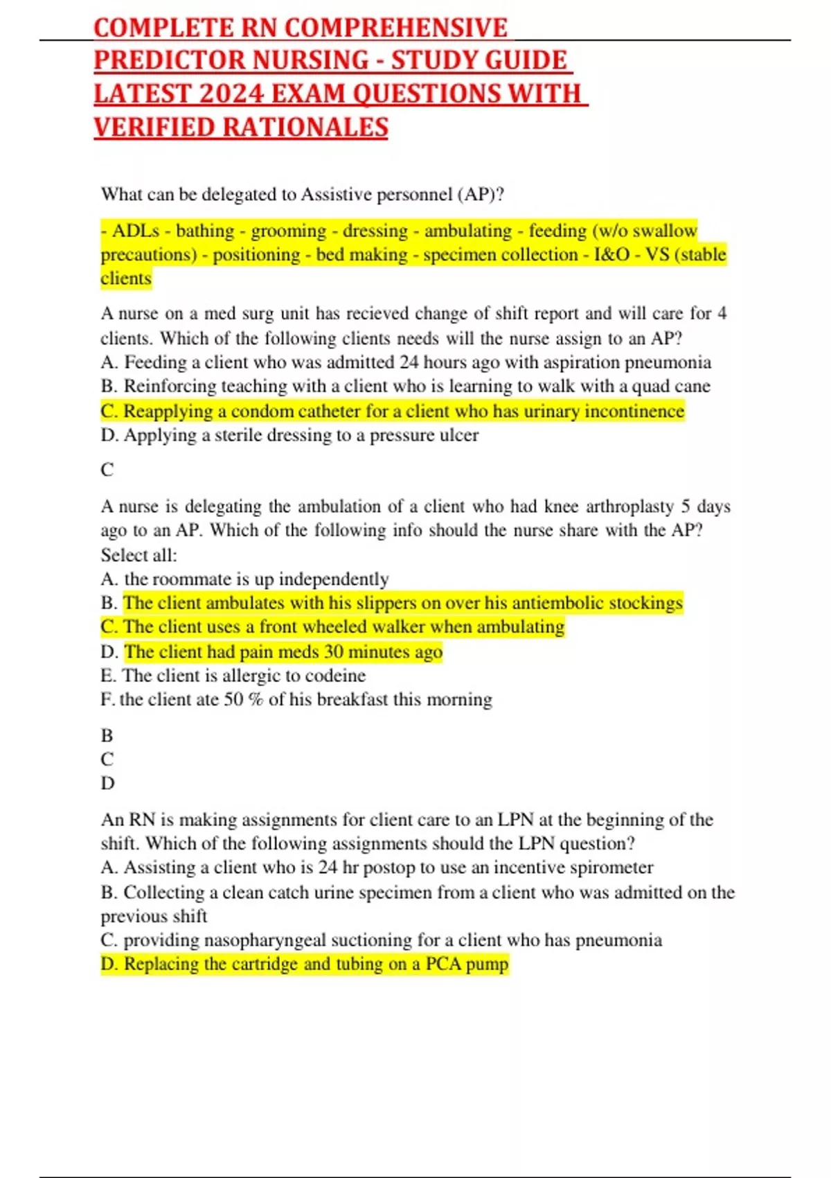 What can be delegated to Assistive personnel (AP)? - ADLs - bathing - grooming - dressing - ambulating - feeding (w/o swallow precautions) - positioning - bed making - specimen collection - I&O - VS (stable clients A nurse on a med surg unit has recieved change of shift report and will care for 4 clients. Which of the following clients needs will the nurse assign to an AP? A. Feeding a client who was admitted 24 hours ago with aspiration pneumonia B. Reinforcing teaching with a client who is learning to walk with a quad cane C. Reapplying a condom catheter for a client who has urinary incontinence D. Applying a sterile dressing to a pressure ulcer C A nurse is delegating the ambulation of a client who had knee arthroplasty 5 days ago to an AP. Which of the following info should the nurse share with the AP? Select all: A. the roommate is up independently B. The client ambulates with his slippers on over his antiembolic stockings C. The client uses a front wheeled walker when ambulating D. The client had pain meds 30 minutes ago E. The client is allergic to codeine F. the client ate 50 % of his breakfast this morning B C D An RN is making assignments for client care to an LPN at the beginning of the shift. Which of the following assignments should the LPN question? A. Assisting a client who is 24 hr postop to use an incentive spirometer B. Collecting a clean catch urine specimen from a client who was admitted on the previous shift C. providing nasopharyngeal suctioning for a client who has pneumonia D. Replacing the cartridge and tubing on a PCA pump COMPLETE RN COMPREHENSIVE PREDICTOR NURSING - STUDY GUIDE LATEST 2024 EXAM QUESTIONS WITH VERIFIED RATIONALES D A nurse is preparing an inservice program about delegation. Which of the following elements should she identify when presenting the 5 rights of delegation. Select all: A. Right client B. Right supervision/evaluation C. Right direction/communication D. Right time E. Right circumstances B C E A nurse manager of a med surg unit is assigning care responsibilities for the oncoming shift. A client is waiting transfer back to the unit from the PACU following thoracic surgery. To which staff member should the nurse assign the client? A. Charge nurse B. RN C. LVN D. AP B What is the study of conduct and character? Ethics What are the values and beliefs that guide behavior and decision making? Morals What is the right to mak