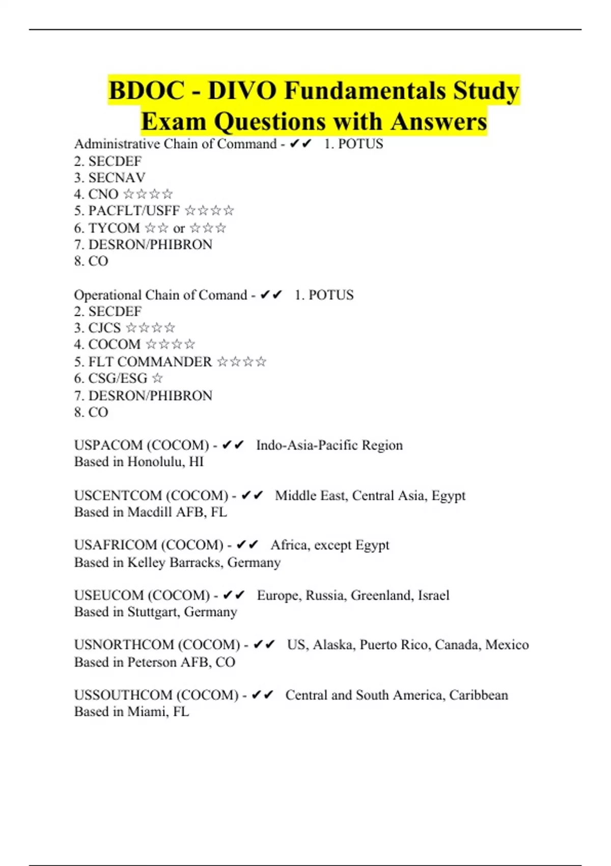Administrative Chain of Command - 1. POTUS 2. SECDEF 3. SECNAV 4. CNO ☆☆☆☆ 5. PACFLT/USFF ☆☆☆☆ 6. TYCOM ☆☆ or ☆☆☆ 7. DESRON/PHIBRON 8. CO Operational Chain of Comand - 1. POTUS 2. SECDEF 3. CJCS ☆☆☆☆ 4. COCOM ☆☆☆☆ 5. FLT COMMANDER ☆☆☆☆ 6. CSG/ESG ☆ 7. DESRON/PHIBRON 8. CO USPACOM (COCOM) - Indo-Asia-Pacific Region Based in Honolulu, HI USCENTCOM (COCOM) - Middle East, Central Asia, Egypt Based in Macdill AFB, FL USAFRICOM (COCOM) - Africa, except Egypt Based in Kelley Barracks, Germany USEUCOM (COCOM) - Europe, Russia, Greenland, Israel Based in Stuttgart, Germany USNORTHCOM (COCOM) - US, Alaska, Puerto Rico, Canada, Mexico Based in Peterson AFB, CO USSOUTHCOM (COCOM) - Central and South America, Caribbean Based in Miami, FL SOCOM (COCOM) - Special Operations Command -Training special forces -Based in Macdill AFB, FL STRATCOM (COCOM) - Strategic Command -Global strike/mission defense/formerly cyber as well -Based in Omaha, NE TRANSCOM (COCOM) - Transportation Command -Provide transportation and logistics in support of DoD assets -Based in Scott AFB, IL USFF (TF 80) - West Atlantic 4th FLT - Caribbean, Central, South America 3rd FLT - East Pacific 7th FLT - West Pacific, Indian Ocean 5th FLT - Arabian Gulf, Red Sea, Gulf of Oman, part of Indian Ocean 6th FLT - East Atlantic, Mediterranean, North Seas 10th FLT - Cyberwarfare Admin vs. Operational Commanders - Administrative - administrative orders from up top Operational - warheads on foreheads, maintaining and training fleets Types of CASREPS - CASINT - Initial - submit NLT 24 hrs if it can't be fixed in 48 CASUP - Update - change to information (New ETR) CASCOR - Correction - equipment has been repaired CASCAN - Cancellation - equipment taken out of use