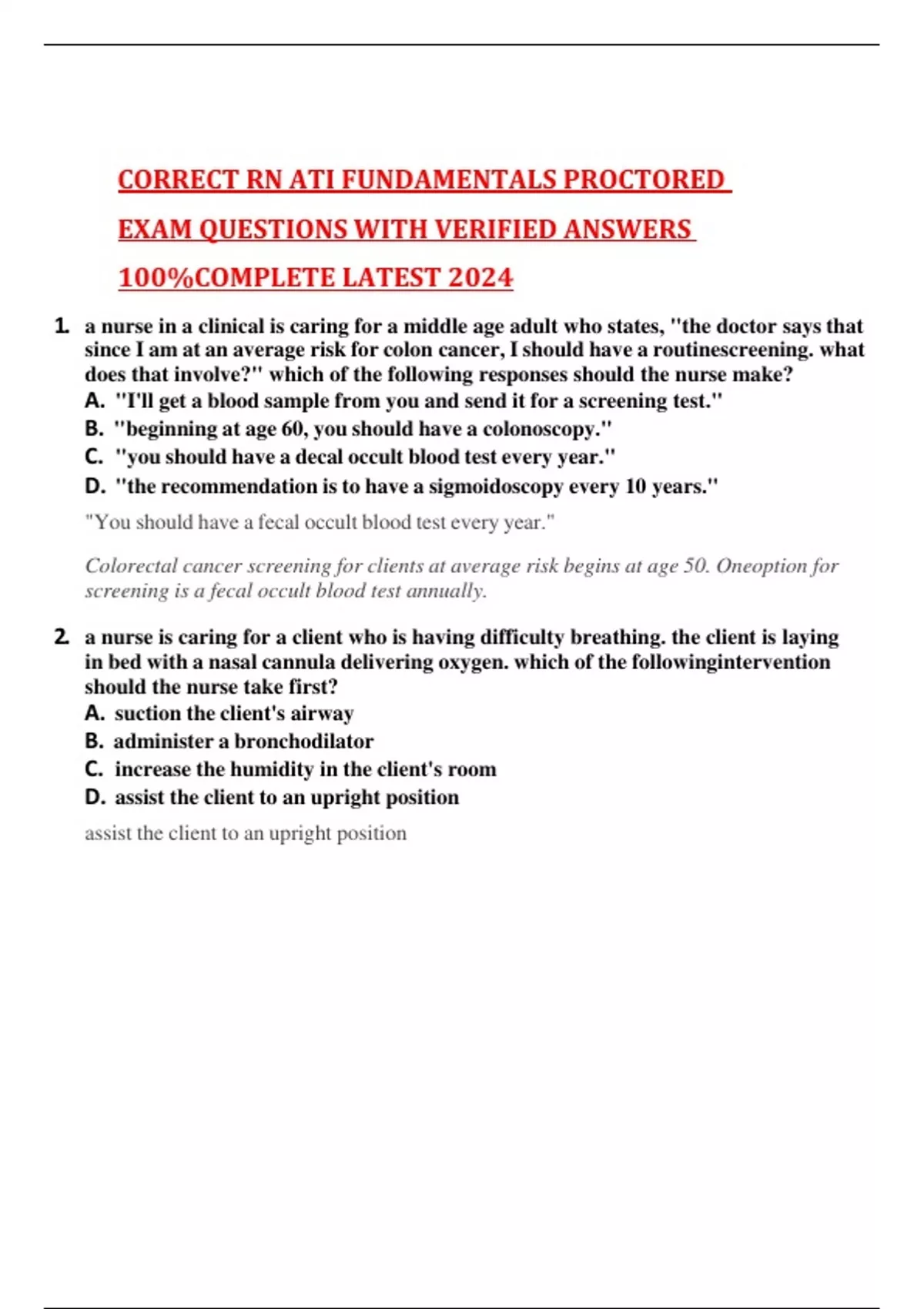 a nurse in a clinical is caring for a middle age adult who states, "the doctor says that since I am at an average risk for colon cancer, I should have a routinescreening. what does that involve?" which of the following responses should the nurse make? A. "I'll get a blood sample from you and send it for a screening test." B. "beginning at age 60, you should have a colonoscopy." C. "you should have a decal occult blood test every year." D. "the recommendation is to have a sigmoidoscopy every 10 years." "You should have a fecal occult blood test every year." Colorectal cancer screening for clients at average risk begins at age 50. Oneoption for screening is a fecal occult blood test annually. 2. a nurse is caring for a client who is having difficulty breathing. the client is laying in bed with a nasal cannula delivering oxygen. which of the followingintervention should the nurse take first? A. suction the client's airway B. administer a bronchodilator C. increase the humidity in the client's room D. assist the client to an upright position assist the client to an upright position When providing client care, the nurse should first use the least invasive intervention. Therefore, the nurse should elevate the head of the client's bedto the semi-Fowler's or high Fowler's position to facilitate maximal chest expansion. Sitting upright improves gas exchange and prevents pressure on the diaphragm from abdominal organs. 3. a nurse is preparing to administer