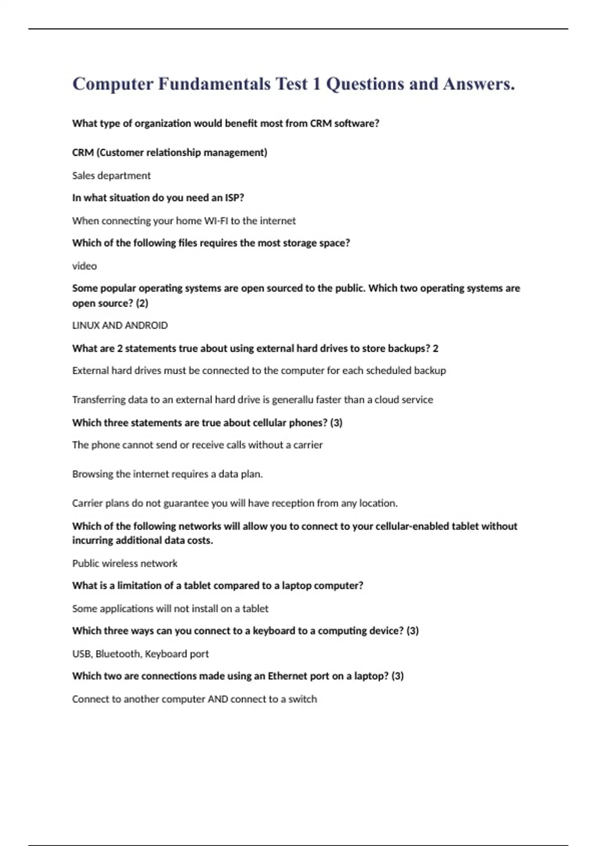 Computer Fundamentals Test 1 Questions and Answers.