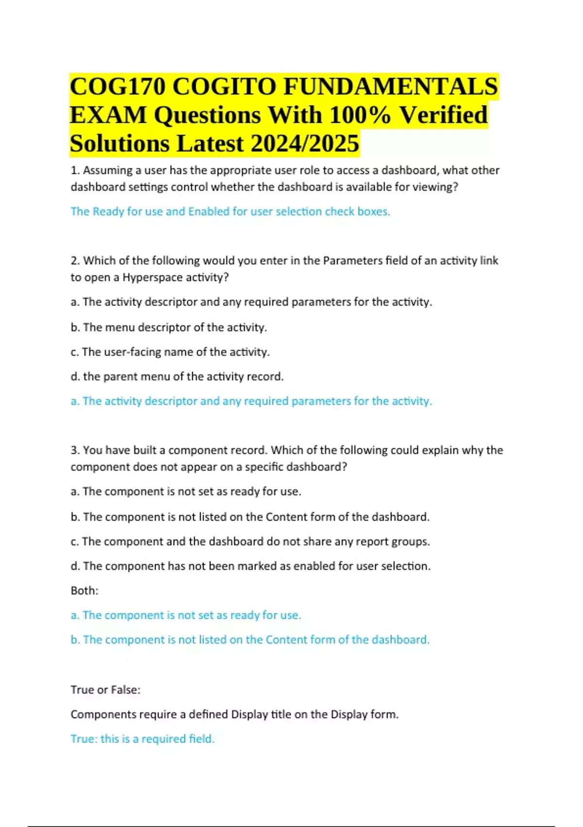COG170 COGITO FUNDAMENTALS EXAM Questions With Answers Latest 2024/2025 | 100% Verified. Which of the following would you enter in the Parameters field of an activity link to open a Hyperspace activity? a. The activity descriptor and any required parameters for the activity. b. The menu descriptor of the activity. c. The user-facing name of the activity. d. the parent menu of the activity record. a. The activity descriptor and any required parameters for the activity. 3. You have built a component record. Which of the following could explain why the component does not appear on a specific dashboard? a. The component is not set as ready for use. b. The component is not listed on the Content form of the dashboard. c. The component and the dashboard do not share any report groups. d. The component has not been marked as enabled for user selection. Both: a. The component is not set as ready for use. b. The component is not listed on the Content form of the dashboard. True or False: Components require a defined Display title on the Display form. True: this is a required field. COG170 COGITO FUNDAMENTALS EXAM Questions With 100% Verified Solutions Latest 2024/2025 Define: Dashboard Dashboards centralize content from around Hyperspace, the graphical user interface which allows users to enter, access and interact with Epic data. Define: Component Each of the sections of content on the dashboard is a component. Components built by administrators are source records Components built by end-users are personalization records. Define: Personalization Dashboards and components which are created by an administrators are referred to as source records. When an end user selects a source dashboard from the Analytics Catalog, a personalized copy is created just for them. End user personalized copies of these source dashboards and components are considered personalization records. Define: Dashboard Editor Create and edit source dashboard records with the dashboard editor. Access the editor with Chart Search, editing a dashboard from the Analytics Catalog, or editing a dashboard from the Proxy Dashboard prompt. 6 forms controls the dashboard's content & metadata: 1. Basic Information 2. Layout 3. Content 4. Resource Settings 5. Parameters 6. Access Additional Information: Dashboard Editor Dashboards should be tailored to their audience and tested to ensure they work. Guidelines for creating and editing Radar content: -Any dashboard available to a user must work -All parts of a dashboard must work -Dashboards must have a defined target audience -Each user in that audience must have security/access for all components and reports on dashboard Define: Component Editor Accessed via Chart Search for Component Editor - Six types of component records in Radar 1. Graph 2. Link 3. Message Board 4. Native HTML 5. Report Listing 6. Table Additional Information: Component Editor Components have Five Forms 1. Basic Information 2. Display 3. Data Source 4. Output Format 5. Access Similar to the Dashboard Editor, each form controls your component's content and its metadata. Define Activity Descriptor The Active activity descriptor field displays for your currently active Hyperspace activity. There are two Hyperspace workflows that can find the activity descriptor for a given activity. Hyperspace workflow 1: Find Activity Descriptor Activity: Create a component which has a header that is able to take you to the Component Editor directly from your Radar dashboard. 1. Access the about Hyperspace information window 2. Double-check that you are currently in the Component Editor activity 3. Access the About Hyperspace window by navigating to the Epic button > Help > About Hyperspace. 4. The Active activity descriptor field displays for your currently active Hyperspace activity. Hyperspace workflow 2: Find Activity Descriptor Activity Descriptor in the Menu Summary: End-users often request links to activities that you lack the security to access. Thus you can not determine the activity descriptor from the About Hyperspace workflow. For these instances, use the following workflow. 1. Use Chart Search to launch the Menu Summary activity. 2. Refer to pg. 2-22 for scenario. 3. Because Admin is under the Epic button, start by expanding EDMAINAPPMENU 4. Any menu that is displayed visually to the end-user will be listed under the caption. 5. Expand the Admin sub-menu 6. Expand the Access Management sub-menu 7. Select User Security Activity Descriptor is located in the Activity Information section. User Security is E_EMP_EMPGUI Perform Task: Create and edit dashboards Run through the following Exercises/Examples