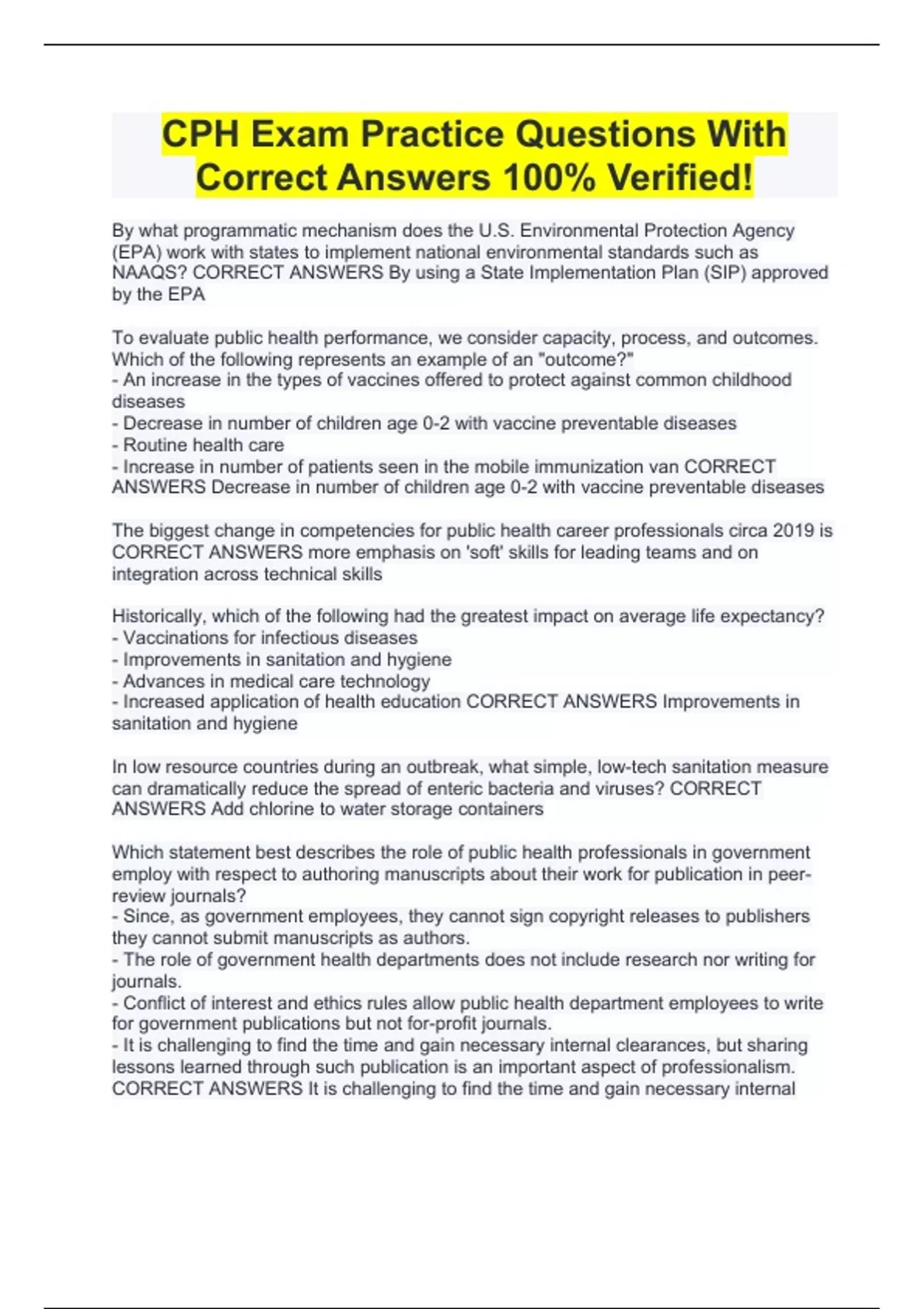 cph exam practice questions with correct answers 1