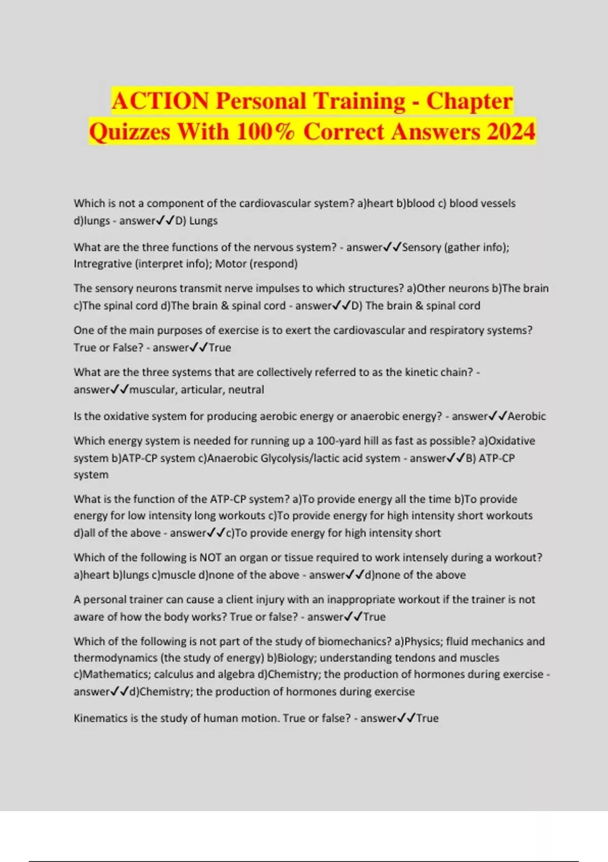 ACTION Personal Training - Chapter Quizzes With 100% Correct Answers 2024 Which is not a component of the cardiovascular system? a)heart b)blood c) blood vessels d)lungs - answerD) Lungs What are the three functions of the nervous system? - answerSensory (gather info); Intregrative (interpret info); Motor (respond) The sensory neurons transmit nerve impulses to which structures? a)Other neurons b)The brain c)The spinal cord d)The brain & spinal cord - answerD) The brain & spinal cord One of the main purposes of exercise is to exert the cardiovascular and respiratory systems? True or False? - answerTrue What are the three systems that are collectively referred to as the kinetic chain? - answermuscular, articular, neutral Is the oxidative system for producing aerobic energy or anaerobic energy? - answerAerobic Which energy system is needed for running up a 100-yard hill as fast as possible? a)Oxidative system b)ATP-CP system c)Anaerobic Glycolysis/lactic acid system - answerB) ATP-CP system What is the function of the ATP-CP system? a)To provide energy all the time b)To provide energy for low intensity long workouts c)To provide energy for high intensity short workouts d)all of the above - answerc)To provide energy for high intensity short Which of the following is NOT an organ or tissue required to work intensely during a workout? a)heart b)lungs c)muscle d)none of the above - answerd)none of the above A personal trainer can cause a client injury with an inappropriate workout if the trainer is not aware of how the body works? True or false? - answerTrue Which of the following is not part of the study of biomechanics? a)Physics; fluid mechanics and thermodynamics (the study of energy) b)Biology; understanding tendons and muscles c)Mathematics; calculus and algebra d)Chemistry; the production of hormones during exercise - answerd)Chemistry; the production of hormones during exercise Kinematics is the study of human motion. True or false? - answerTrue What are the five biomechanical processes that occur duriing a warm-up exercise? - answercardiorespiratory changes (increased utilization of oxygen by muscles), increased blood flow to active muscles, heightened body temp, enhanced motor skills and brain transmissions with nervous impulses moving faster, increased discomfort from muscles and cardiorespiratory system What are the three groups of proprioceptors? - answerLigament, joint and skin proprioceptors, neck and inner ear proprioceptors, muscle proprioceptors As you walk from one end of the room to the other, what forces are influencing your movement? a)gravity b)friction c)tension d)all of the above - answerd)all of the above What is the opposite of the motion pronation (to turn the palms face down)? - answerSupination What are the three planes of motion that intersect in the body? - answerTraverse plane, sagittal plane, frontal plane Concentric, eccentric and isometric/static are the names of three major types of what? - answerMuscle action How is muscle strength typically measured? - answerMMT - Manual muscle test What system of the body plays a role in proprioception (perception of an object's position)? a)nervous system b)cardiorespiratory system c)immunce system d)digestive system - answera)nervous system What is the purpose of the initial client assessment? a)to learn about the client b)to efficiently tailor the proper workout regimen c)to understand the likes and dislikes of the client d)all of the above - answerd)all of the above One of the many jobs a personal trainer has is to advise the client on how to handle any unresolved medical issues they may have. True or false? - answerFalse In order to keep the client's medical information private, the personal trainer should put a ________ in the assessment form. - answerConfidentiality clause All of the following are considered lifestyle categories: hobbies, physical activities, workout in front of a computer and nutritional habits. True or false? - answerTrue Knowing what medications the client is taking and possible side effects are important because a)the trainer may need to borrow some if the medication runs out b)the client may be allergic to certain medications c)there may be conflicts between the recommended workout and the medication d)the trainer may need to refill the prescription - answerc)there may be conflicts between the recommended workout and the medication