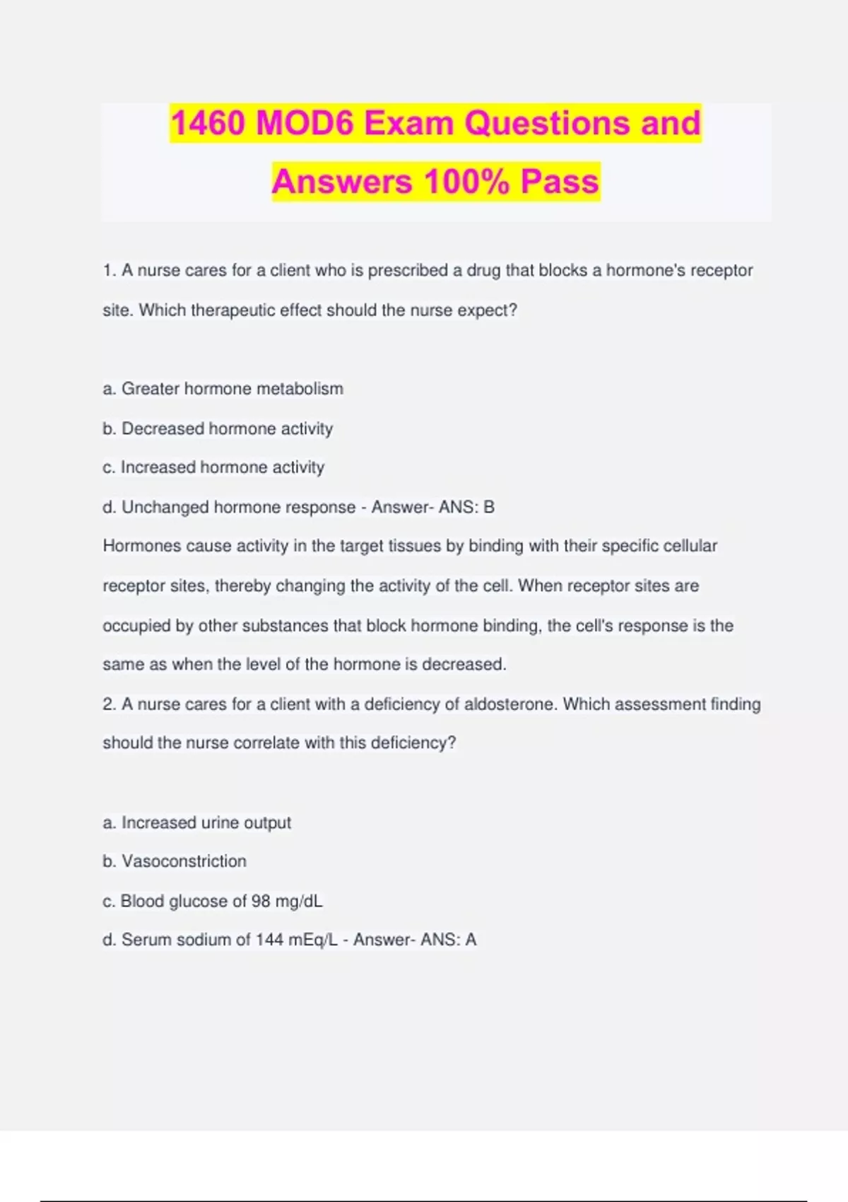 1460 MOD6 Exam Questions and Answers 100% Pass 1. A nurse cares for a client who is prescribed a drug that blocks a hormone's receptor site. Which therapeutic effect should the nurse expect? a. Greater hormone metabolism b. Decreased hormone activity c. Increased hormone activity d. Unchanged hormone response - Answer- ANS: B Hormones cause activity in the target tissues by binding with their specific cellular receptor sites, thereby changing the activity of the cell. When receptor sites are occupied by other substances that block hormone binding, the cell's response is the same as when the level of the hormone is decreased. 2. A nurse cares for a client with a deficiency of aldosterone. Which assessment finding should the nurse correlate with this deficiency? a. Increased urine output b. Vasoconstriction c. Blood glucose of 98 mg/dL d. Serum sodium of 144 mEq/L - Answer- ANS: A Aldosterone, the major mineralocorticoid, maintains extracellular fluid volume. It promotes sodium and water reabsorption and potassium excretion in the kidney tubules. A client with an aldosterone deficiency will have increased urine output. Vasoconstriction is not related. These sodium and glucose levels are normal; in aldosterone deficiency, the client would have hyponatremia and hyperkalemia. 3. A nurse cares for a client with excessive production of thyrocalcitonin (calcitonin). For which electrolyte imbalance should the nurse assess? a. Potassium b. Sodium c. Calcium d. Magnesium - Answer- ANS: C Parafollicular cells produce thyrocalcitonin (calcitonin), which regulates serum calcium levels. Calcitonin has no impact on potassium, sodium, or magnesium balances. 4. A nurse assesses a client who is prescribed a medication that stimulates beta1 receptors. Which assessment finding should alert the nurse to urgently contact the health care provider? a. Heart rate of 50 beats/min b. Respiratory rate of 18 breaths/min c. Oxygenation saturation of 92% d. Blood pressure of 144/69 mm Hg - Answer- ANS: A Stimulation of beta1 receptor sites in the heart has positive chronotropic and inotropic actions. The nurse expects an increase in heart rate and increased cardiac output. The client with a heart rate of 50 beats/min would be cause for concern because this would indicate that the client was not responding to the medication. The other vital signs are within normal limits and do not indicate a negative response to the medication. 5. A nurse prepares to palpate a client's thyroid gland. Which action should the nurse take when performing this assessment? a. Stand in front of the client instead of behind the client. b. Ask the client to swallow after palpating the thyroid. c. Palpate the right lobe with the nurse's left hand. d. Place the client in a sitting position with the chin tucked down. - Answer- ANS: D The client should be in a sitting position with the chin tucked down as the examiner stands behind the client. The nurse feels for the thyroid isthmus while the client swallows and turns the head to the right, and the nurse palpates the right lobe with the right hand. The technique is repeated in the opposite fashion for the left lobe. 6. A nurse collaborates with an unlicensed assistive personnel (UAP) to provide care for a client who is prescribed a 24-hour urine specimen collection. Which statement should the nurse include when delegating this activity to the UAP? a. "Note the time of the client's first void and collect urine for 24 hours." b. "Add the preservative to the container at the end of the test." c. "Start the collection by saving the first urine of the morning." d. "It is okay if one urine sample during the 24 hours is not collected." - Answer- ANS: A The collection of a 24-hour urine specimen is often delegated to a UAP. The nurse must ensure that the UAP understands the proper process for collecting the urine. The 24- hour urine collection specimen is started after the client's first urination. The first urine specimen is discarded because there is no way to know how long it has been in the bladder, but the time of the client's first void is noted. The client adds all urine voided after that first discarded specimen during the next 24 hours. When the 24-hour mark is reached, the client voids one last time and adds this specimen to the collection. The preservative, if used, must be added to the container at the beginning of the collection. All urine samples need to be collected for the test results to be accurate. 7. A nurse assesses a female client who presents with hirsutism. Which question should the nurse ask when assessing this client? a. "How do you plan to pay for your treatments?" b. "How do you feel about yourself?" c. "What medications are you prescribed?" d. "What are you doing to prevent this from happening?" - Answer- ANS: B Hirsutism, or excessive hair growth on the face and body, can result from endocrine disorders. This may cause a disruption in body image, especially for female clients. The nurse should inquire into the client's body image and self-perception. Asking about the client's financial status or current medications does not address the client's immediate problem. The client is not doing anything to herself to cause the problem, nor can the client prevent it from happening. 8. A nurse teaches a client who has been prescribed a 24-hour urine collection to measure excreted hormones. The client asks, "Why do I need to collect urine for 24 hours instead of providing a random specimen?" How should the nurse respond? a. "This test will assess for a hormone secreted on a circadian rhythm." b. "The hormone is diluted in urine; therefore, we need a large volume." c. "We are assessing when the hormone is secreted in large amounts." d. "To collect the correct hormone, you need to urinate multiple times." - Answer- ANS: A Some hormones are secreted in a pulsatile, or circadian, cycle. When testing for these substances, a collection that occurs over 24 hours will most accurately reflect hor