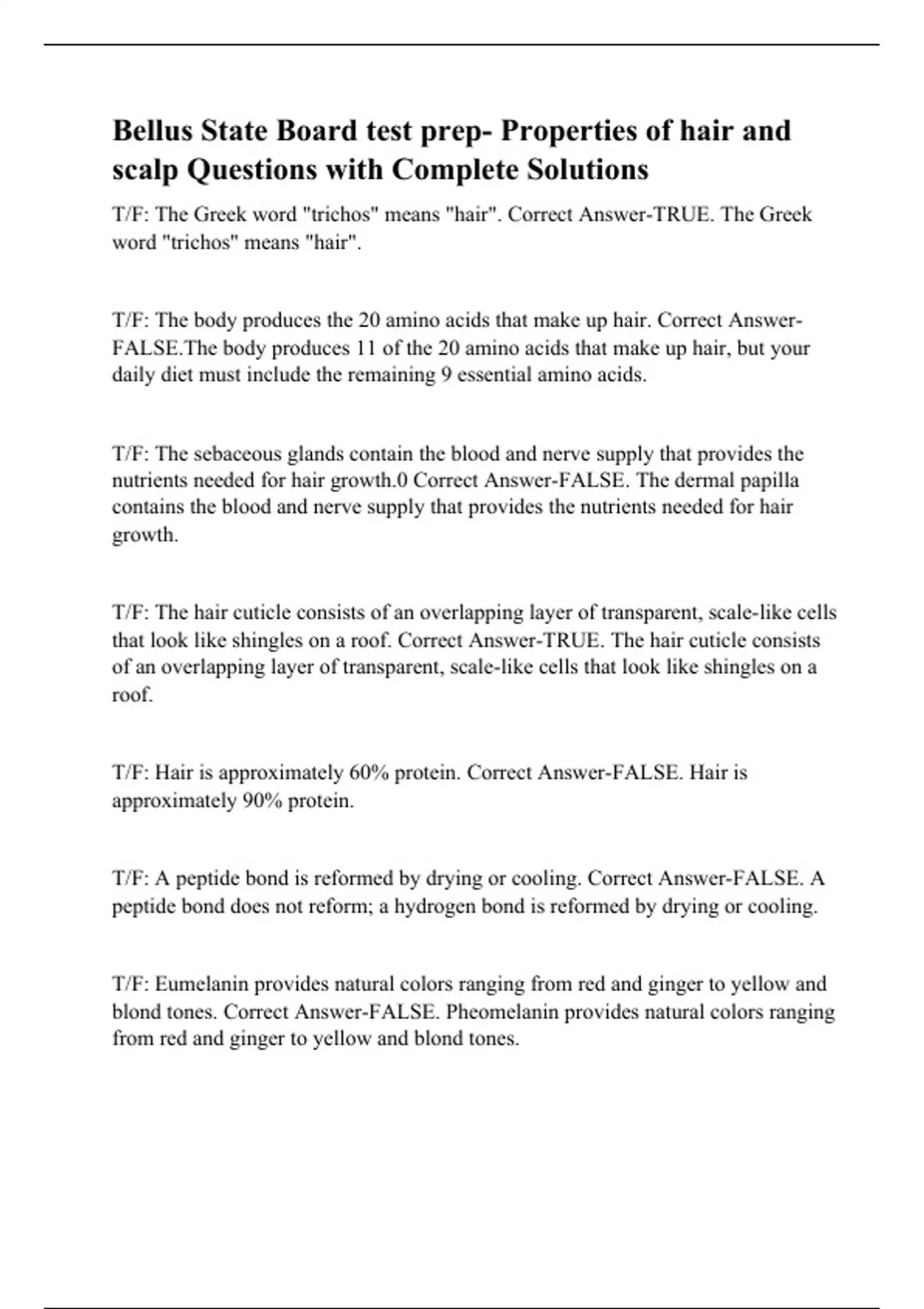 Bellus State Board test prep- Properties of hair and scalp Questions with Complete Solutions