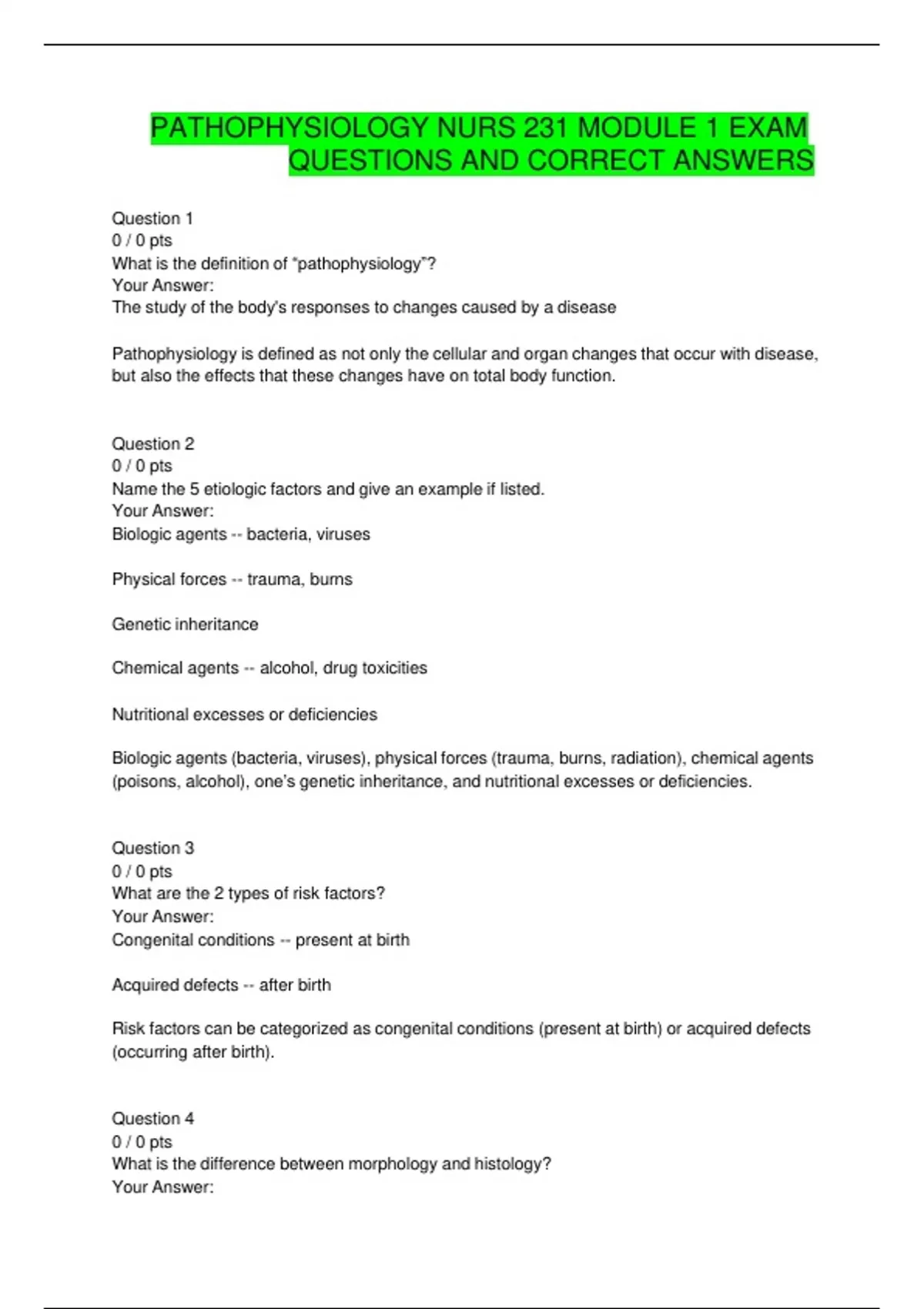 PATHOPHYSIOLOGY NURS 231 MODULE 1 EXAM QUESTIONS AND CORRECT ANSWERS Question 1 0 / 0 pts What is the definition of “pathophysiology”? Your Answer: The study of the body's responses to changes caused by a disease Pathophysiology is defined as not only the cellular and organ changes that occur with disease, but also the effects that these changes have on total body function. Question 2 0 / 0 pts Name the 5 etiologic factors and give an example if listed. Your Answer: Biologic agents -- bacteria, viruses Physical forces -- trauma, burns Genetic inheritance Chemical agents -- alcohol, drug toxicities Nutritional excesses or deficiencies Biologic agents (bacteria, viruses), physical forces (trauma, burns, radiation), chemical agents (poisons, alcohol), one’s genetic inheritance, and nutritional excesses or deficiencies. Question 3 0 / 0 pts What are the 2 types of risk factors? Your Answer: Congenital conditions -- present at birth Acquired defects -- after birth Risk factors can be categorized as congenital conditions (present at birth) or acquired defects (occurring after birth). Question 4 0 / 0 pts What is the difference between morphology and histology? Your Answer: Morphology is the structure or form of cells and tissues Histology is the study of the cells and extracellular matrix of body tissues Morphology is defined as the fundamental structure or form of cells or tissues. Histology is the study of the cells and extracellular matrix of body tissues. Question 5 0 / 0 pts Describe the difference between signs and symptoms and give an example of each. Your Answer: Sign is an objective manifestation -- temperature or changes in pupil size Symptoms is a subjective complaint -- pain, dizziness or troubled breathing A symptom is a subjective complaint, for example pain, trouble breathing, or dizziness. A sign is an objective manifestation, for example an elevated temperature, a swollen extremity, or changes in pupil size. Question 6 0 / 0 pts What are 3 important processes when coming to a diagnosis? Your Answer: Family history, physical examination, diagnostic tests The diagnostic process requires a careful history, physical examination (PE), and sometimes diagnostic tests.