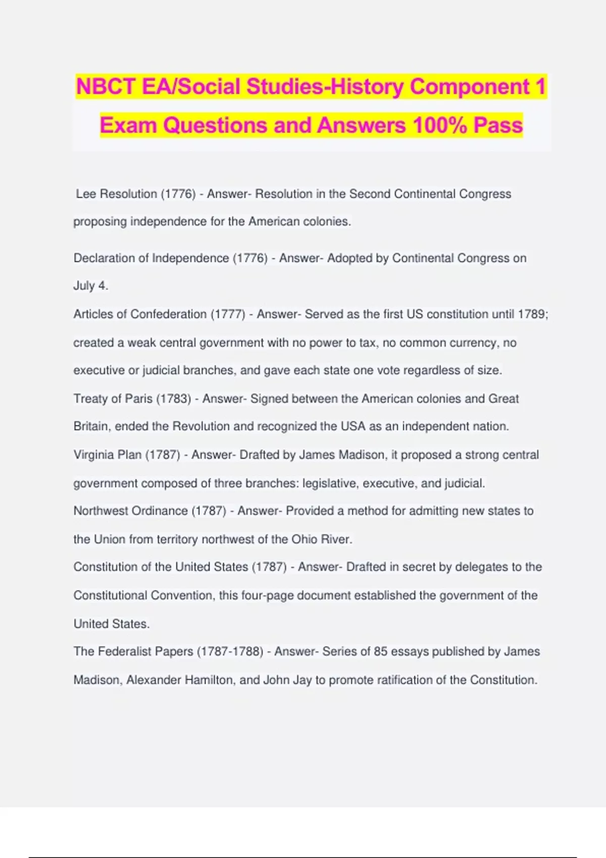 NBCT EA/Social Studies-History Component 1 Exam Questions and Answers 100% Pass Lee Resolution (1776) - Answer- Resolution in the Second Continental Congress proposing independence for the American colonies. Declaration of Independence (1776) - Answer- Adopted by Continental Congress on July 4. Articles of Confederation (1777) - Answer- Served as the first US constitution until 1789; created a weak central government with no power to tax, no common currency, no executive or judicial branches, and gave each state one vote regardless of size. Treaty of Paris (1783) - Answer- Signed between the American colonies and Great Britain, ended the Revolution and recognized the USA as an independent nation. Virginia Plan (1787) - Answer- Drafted by James Madison, it proposed a strong central government composed of three branches: legislative, executive, and judicial. Northwest Ordinance (1787) - Answer- Provided a method for admitting new states to the Union from territory northwest of the Ohio River. Constitution of the United States (1787) - Answer- Drafted in secret by delegates to the Constitutional Convention, this four-page document established the government of the United States. The Federalist Papers () - Answer- Series of 85 essays published by James Madison, Alexander Hamilton, and John Jay to promote ratification of the Constitution. Federal Judiciary Act (1789) - Answer- One of the first acts of the new Congress was to establish a Federal court system through this Act signed by President Washington. Bill of Rights (1791) - Answer- Defined citizens' rights in relation to the newly established government under the Constitution. Cotton Gin (1794) - Answer- Eli Whitney's design to separate cotton fiber from seed; a profitable technology to agricultural production in America. President Washington's Farewell Address (1796) - Answer- Advised citizens to view themselves as a cohesive unit and avoid political parties; warning to be wary of attachments and entanglements with other nations. Alien & Sedition Acts (1798) - Answer- Passed in preparation for anticipated war with France, these tightened restrictions on foreign-born Americans and limited speech critical of the Government. Jefferson's Secret Message to Congress Regarding the Lewis & Clark Expedition (1803) - Answer- Asked Congress for $2,500 to explore the West--all the way to the Pacific Ocean. At the time, the territory did not belong to the US. Congress agreed to fund the expedition that would be led by Meriwether Lewis and William Clark. Louisiana Purchase (1803) - Answer- United States purchased 828,000 square miles of land west of the Mississippi River for $15 million from France. The US doubled its size, expanding the nation westward. Marbury v. Madison (1803) - Answer- Supreme Court established the right of courts to determine the constitutionality of the actions of the other two branches of government. Treaty of Ghent (1814) - Answer- Ended the War of 1812, fought between Great Britain and the United States. McCulloch v. Maryland (1819) - Answer- This case involved the power of Congress to charter a bank, which sparked the broader issue of the division of powers between states and the federal Government. Missouri Compromise (1820) - Answer- Admitted Missouri as a slave state and Maine as a non-slave state at the same time, so as not to upset the balance between slave and free states in the nation. It also outlawed slavery above the 36"30' latitude line in the remainder of the Louisiana Territory. Monroe Doctrine (1823) - Answer- European powers were obligated to respect the Western Hemisphere as the United States' sphere of interest. Gibbons v. Ogden (1824) - Answer- Supreme Court ruled that Congress has the power to "regulate commerce" and Federal law takes precedence over state laws. President Andrew Jackson's Message to Congress 'On Indian Removal' (1830) - Answer- Called for the relocation of eastern Native American tribes to land west of the Mississippi River, in order to open new land for settlement by citizens of the United States. Treaty of Guadalupe Hidalgo (1848) - Answer- Ended the war between the United States and Mexico. Mexico ceded 55% of its territory, includi