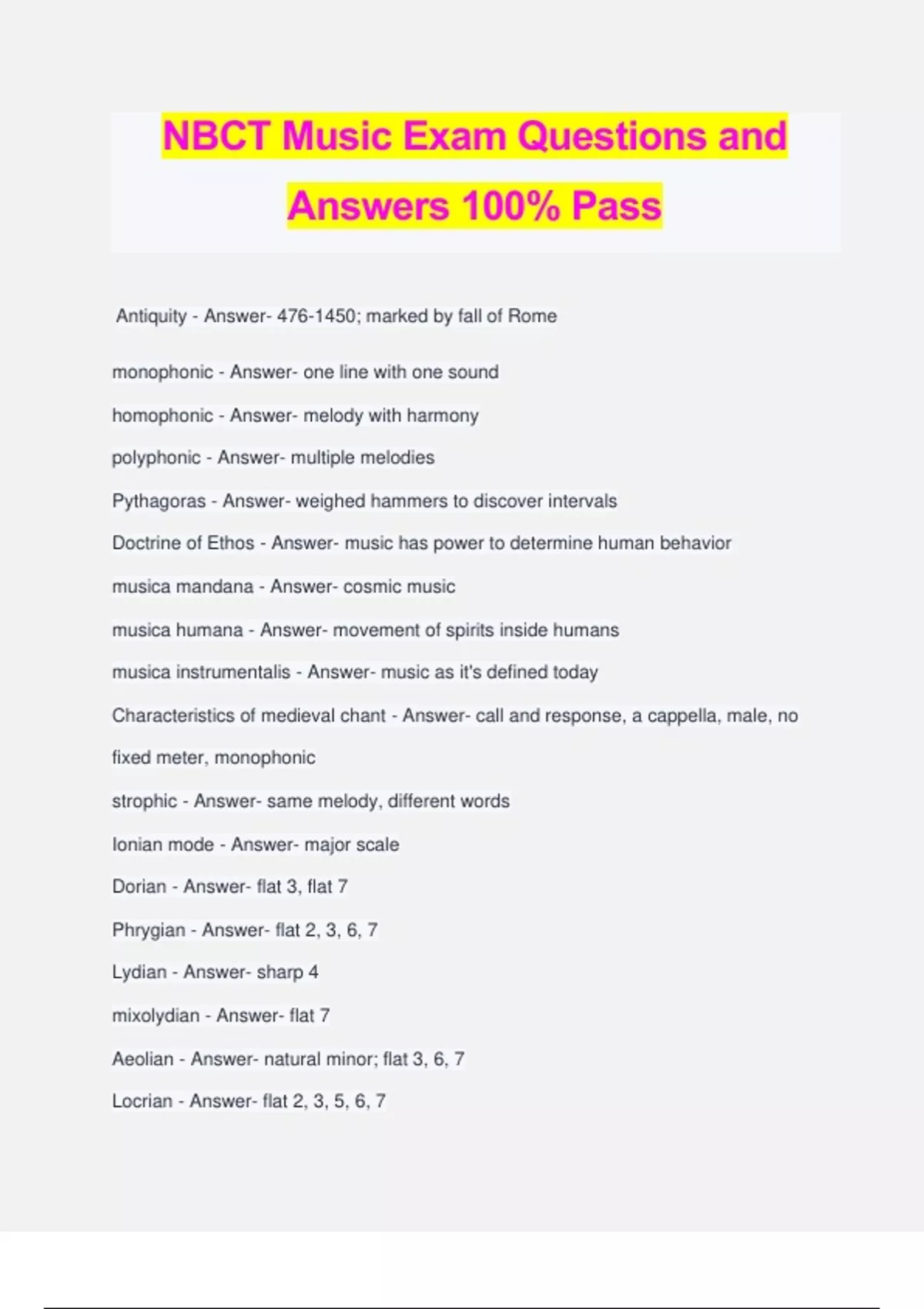 NBCT Music Exam Questions and Answers 100% Pass Antiquity - Answer- 476-1450; marked by fall of Rome monophonic - Answer- one line with one sound homophonic - Answer- melody with harmony polyphonic - Answer- multiple melodies Pythagoras - Answer- weighed hammers to discover intervals Doctrine of Ethos - Answer- music has power to determine human behavior musica mandana - Answer- cosmic music musica humana - Answer- movement of spirits inside humans musica instrumentalis - Answer- music as it's defined today Characteristics of medieval chant - Answer- call and response, a cappella, male, no fixed meter, monophonic strophic - Answer- same melody, different words Ionian mode - Answer- major scale Dorian - Answer- flat 3, flat 7 Phrygian - Answer- flat 2, 3, 6, 7 Lydian - Answer- sharp 4 mixolydian - Answer- flat 7 Aeolian - Answer- natural minor; flat 3, 6, 7 Locrian - Answer- flat 2, 3, 5, 6, 7 Guido of Arezzo - Answer- inventor of solfege troubadour - Answer- secular musician from southern France trouvere - Answer- secular musician from northern France minnesinger - Answer- secular musician from Germany organum - Answer- medieval polyphony with precomposed Gregorian chant and one (or more) lines diabolus in musica - Answer- tritone vox principalis - Answer- original chant notated on top vox organalis - Answer- harmony written P5 away classical singing timbre - Answer- high palate, open sound, vibrato, pure vowel tones popular singing timbre - Answer- less vibrato, less palate control 3 registers for men - Answer- chest, head, falsetto 3 registers for women - Answer- chest, middle, head chest register - Answer- lower ranges, heavier tonal quality head voice - Answer- upper ranges, lighter tonal quality falsetto voice - Answer- highest ranges, breathy and airy tonal quality 3 main vocal parts involved in creating sound - Answer- air supply, vibrator, resonator root position chord - Answer- root is lowest sounding pitch first inversion - Answer- third is lowest sounding pitch second inversion - Answer- fifth is lowest sounding pitch third inversion - Answer- seventh is lowest sounding pitch authentic cadence - Answer- V-I or V-i