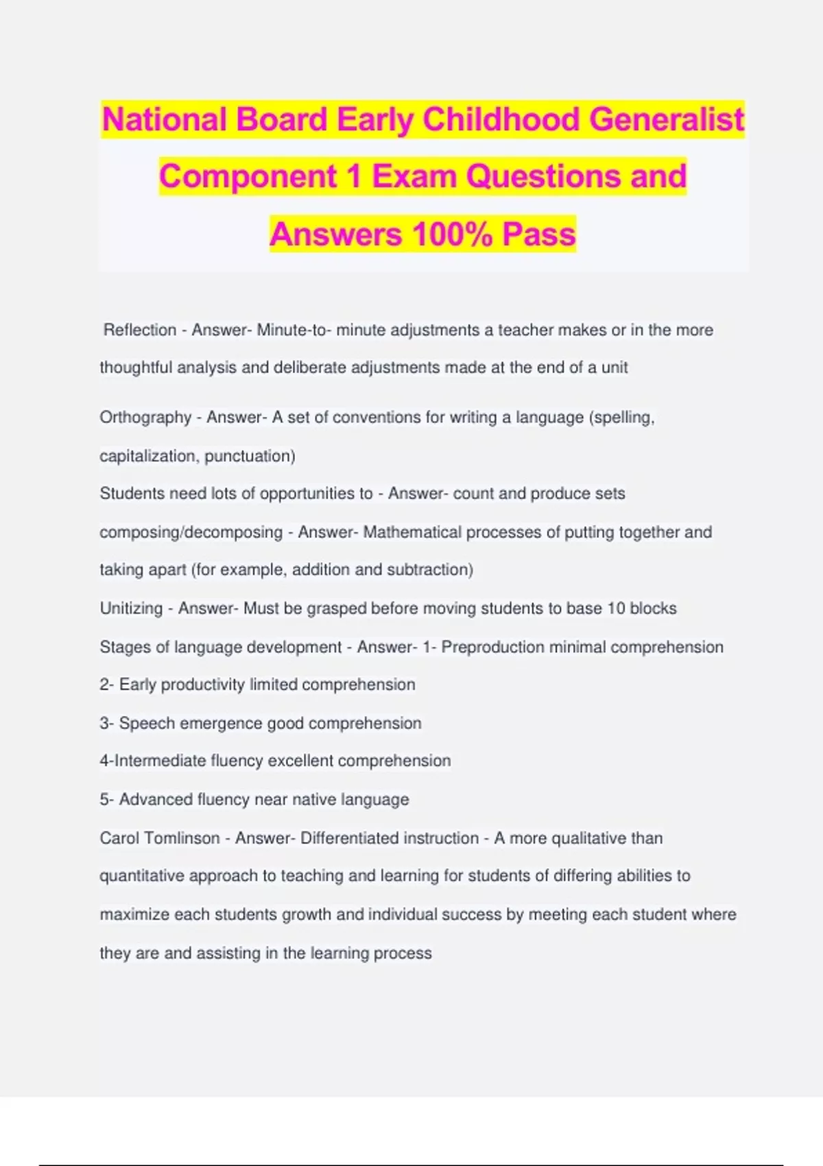 National Board Early Childhood Generalist Component 1 Exam Questions and Answers 100% Pass Reflection - Answer- Minute-to- minute adjustments a teacher makes or in the more thoughtful analysis and deliberate adjustments made at the end of a unit Orthography - Answer- A set of conventions for writing a language (spelling, capitalization, punctuation) Students need lots of opportunities to - Answer- count and produce sets composing/decomposing - Answer- Mathematical processes of putting together and taking apart (for example, addition and subtraction) Unitizing - Answer- Must be grasped before moving students to base 10 blocks Stages of language development - Answer- 1- Preproduction minimal comprehension 2- Early productivity limited comprehension 3- Speech emergence good comprehension 4-Intermediate fluency excellent comprehension 5- Advanced fluency near native language Carol Tomlinson - Answer- Differentiated instruction - A more qualitative than quantitative approach to teaching and learning for students of differing abilities to maximize each students growth and individual success by meeting each student where they are and assisting in the learning process Differentiation - Answer- Teachers response to the learners needs : respectful tasks, continual assessment, flexible grouping Teachers can differentiate - Answer- Content, process, product Differentiate according to students - Answer- Readiness, interests, learning profile Differentiated Instructional strategies - Answer- Learning stations, task cards, target different senses, think-pair-share, group students with similar learning styles Stages of Phonological Awareness/Literacy Development - Answer- 1&2-Listening and speaking 3-Rhyme awareness 4-Syllable awareness (Mon•day) 5-Onset & Rhyme (t•all) 6&7- Phonemic Awareness (pencil) 5 sounds 8- Phonics - sound /letter relationships 9&10 Phonics - reading & spelling Homonyms - Answer- Spruce- to spruce up Spruce - spruce tree Homographs - Answer- Bow- to bend down Bow- ribbon Homophones - Answer- Rode/Road Affixes - Answer- prefixes and suffixes Root words - Answer- morphemes Schwa - Answer- Mysterious unstressed vowel (banana) /u/ Developmental Stages of Writing - Answer- 1. Pre-Literate - scribble, symbolic stage, directional scribble, mock letters 2. Emergent - letter strings, letter groups, labels pictures, environmental print 3. Transitional - Letter/Word representation, first/last letter (ct=cat) 4. Fluent - Beginning phrase writing, sentence writing Stages of Writing - Answer- 1. Planning 2. First Draft 3. Revising 4. Editing 5. Publishing Steps in the research paper - Answer- 1. Identify topic 2. Develop ideas 3. Gather content 4. Evaluate resources 5. Create citations Commutative Property - Answer- A+B=C B+A=C Associative Property - Answer- (a+b)+c=a+(b+c) (ab)c=a(bc) Distributive Property - Answer- a(b + c) = ab + ac Identity Property of Multiplication - Answer- If you multiply a number by one, the product is the same as that number. Identity Property of Addition - Answer- If you add zero to a number, the sum is the same as that number. Convert percentage to a decimal - Answer- divide by 100 EX: 45%: 45% / 100= 0.45 To convert a fraction to a percent - Answer- 1. change the fraction to a decimal 2. change the decimal to a percentage EX: 2/5 = 0.4 = 40% Conflict Resolution Strategies - Answer- Be calm, apologize, listen, share feelings, choose different activity, take turns, ask for help, creative drama, journaling • for emotional development and self regulation Inquiry-based learning - Answer- Students develop hypotheses, collect information/data to test the hypotheses and analyze information/data and formulate conclusions based on the analyses. This is sometimes referred to as the scientific method. •Ask, Investigate, Create, Discuss, Reflects Inquiry-based learning - Answer- Discovering the question Project-based learning - Answer- Exploring the answer Howard Gardner's Theory of Multiple Intelligence - Answer- 1- verbal linguistic 2- Logical/mathematics 3- Spatial/visual 4- Body/kinesthetic 5-Musical 6- Interpersonal 7- Intrapersonal 8- Naturalist 9-Existential Piaget's Theory - Answer- The theory that children construct their understanding of the world and go through four stages of cognitive development. -Facilitate learning- student centered- learn by doing- problem solving must be discovered not taught- collaborate- active learning-build schema-evaluate development- development comes before learning Piaget: Assimilation and Accommodation - Answer- 1. ASSIMILATION: The process of taking in new information and interpreting it in such a manner that the information conforms to a current held model of the world. (Individuals perceive the environment in a way that fits existing schemata.)