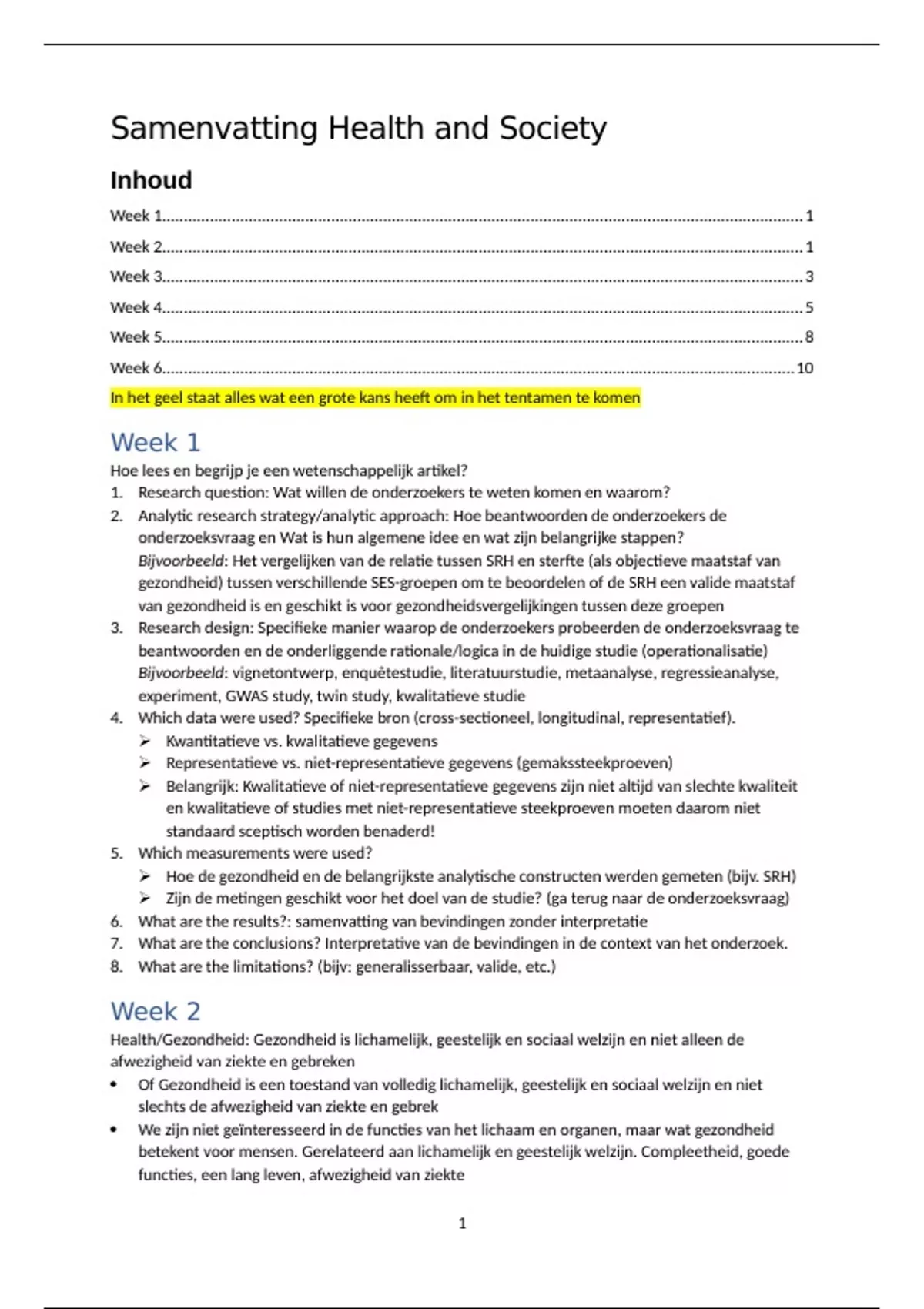 Samenvatting van alle hoorcolleges, werkgroepen en literatuur, inclusief belangrijkste onderwerpen aangegeven door werkgroep- en lecturedocenten (door middel van gele markeringen)