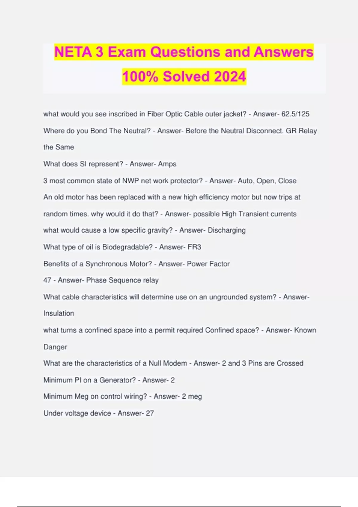 NETA 3 Exam Questions and Answers 100% Solved 2024 what would you see inscribed in Fiber Optic Cable outer jacket? - Answer- 62.5/125 Where do you Bond The Neutral? - Answer- Before the Neutral Disconnect. GR Relay the Same What does SI represent? - Answer- Amps 3 most common state of NWP net work protector? - Answer- Auto, Open, Close An old motor has been replaced with a new high efficiency motor but now trips at random times. why would it do that? - Answer- possible High Transient currents what would cause a low specific gravity? - Answer- Discharging What type of oil is Biodegradable? - Answer- FR3 Benefits of a Synchronous Motor? - Answer- Power Factor 47 - Answer- Phase Sequence relay What cable characteristics will determine use on an ungrounded system? - Answer- Insulation what turns a confined space into a permit required Confined space? - Answer- Known Danger What are the characteristics of a Null Modem - Answer- 2 and 3 Pins are Crossed Minimum PI on a Generator? - Answer- 2 Minimum Meg on control wiring? - Answer- 2 meg Under voltage device - Answer- 27