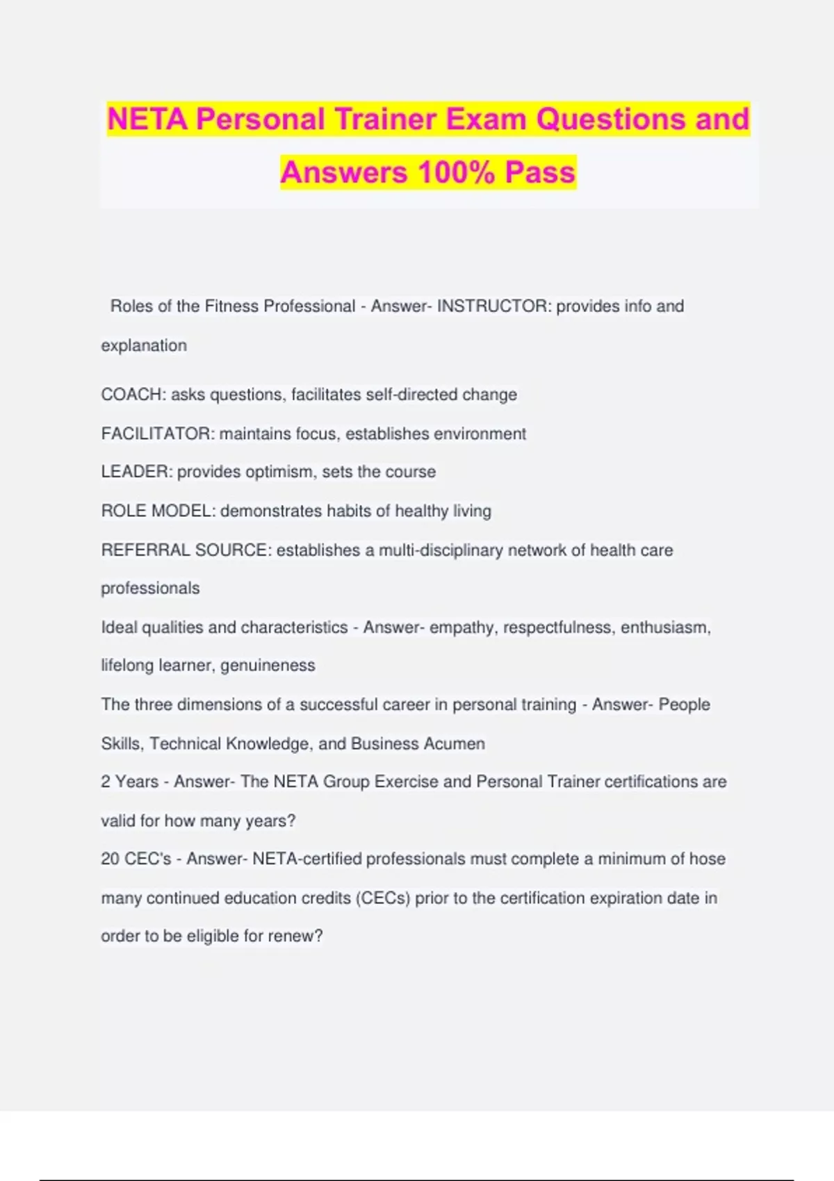 NETA Personal Trainer Exam Questions and Answers 100% Pass