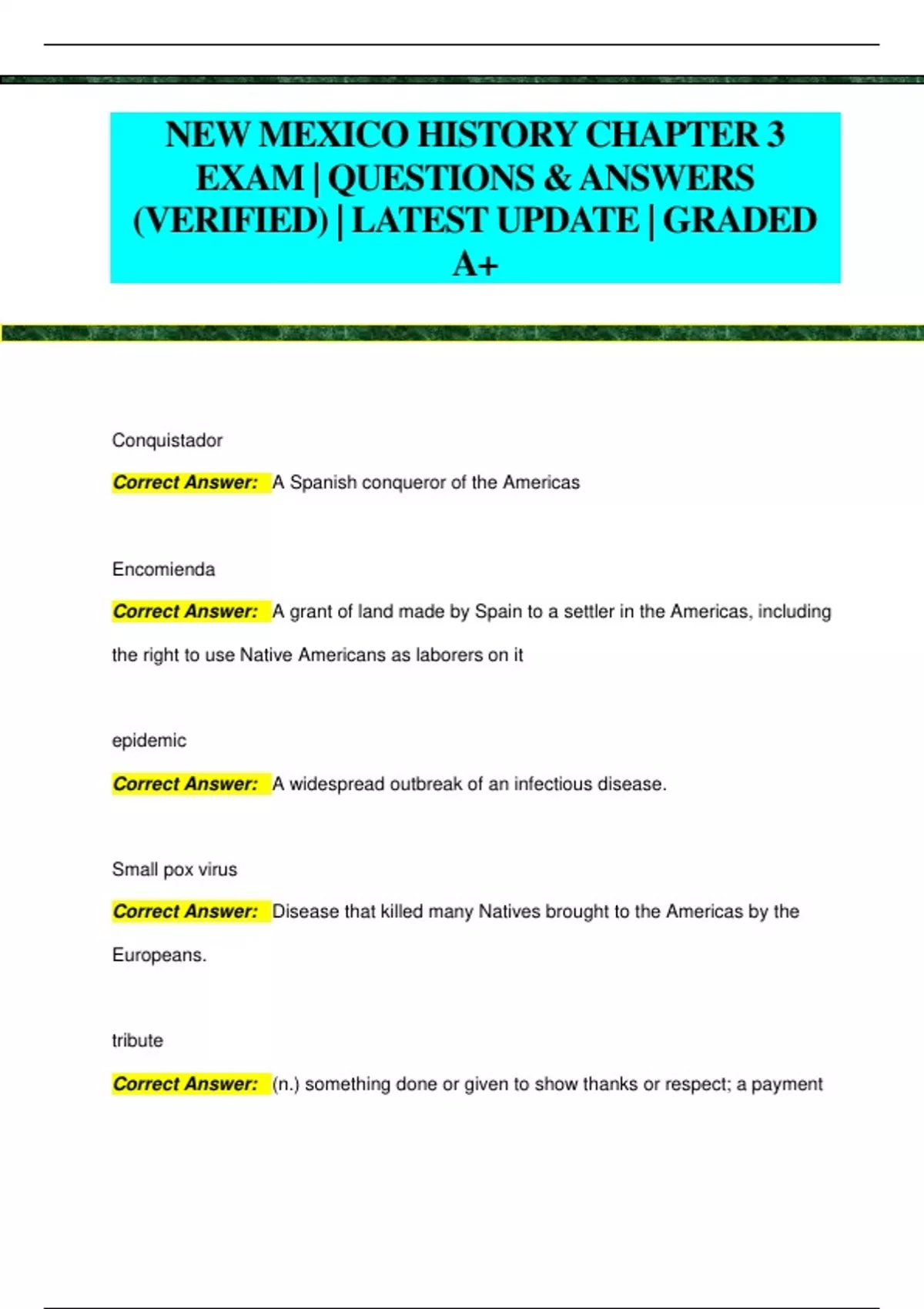 NEW MEXICO HISTORY CHAPTER 3 EXAM | QUESTIONS & ANSWERS (VERIFIED) | LATEST UPDATE | GRADED A+ Conquistador Correct Answer: A Spanish conqueror of the Americas Encomienda Correct Answer: A grant of land made by Spain to a settler in the Americas, including the right to use Native Americans as laborers on it epidemic Correct Answer: A widespread outbreak of an infectious disease. Small pox virus Correct Answer: Disease that killed many Natives brought to the Americas by the Europeans. tribute Correct Answer: (n.) something done or given to show thanks or respect; a payment Christopher Columbus Correct Answer: He mistakenly discovered the Americas in 1492 while searching for a faster route to India. Silk Road Correct Answer: An ancient trade route between China and the Mediterranean Sea extending some 6,440 km (4,000 mi) and linking China with the Roman Empire. Marco Polo followed the route on his journey to Cathay. Bartolome de Las Casas Correct Answer: Dominican priest who spoke out against mistreatment of Native