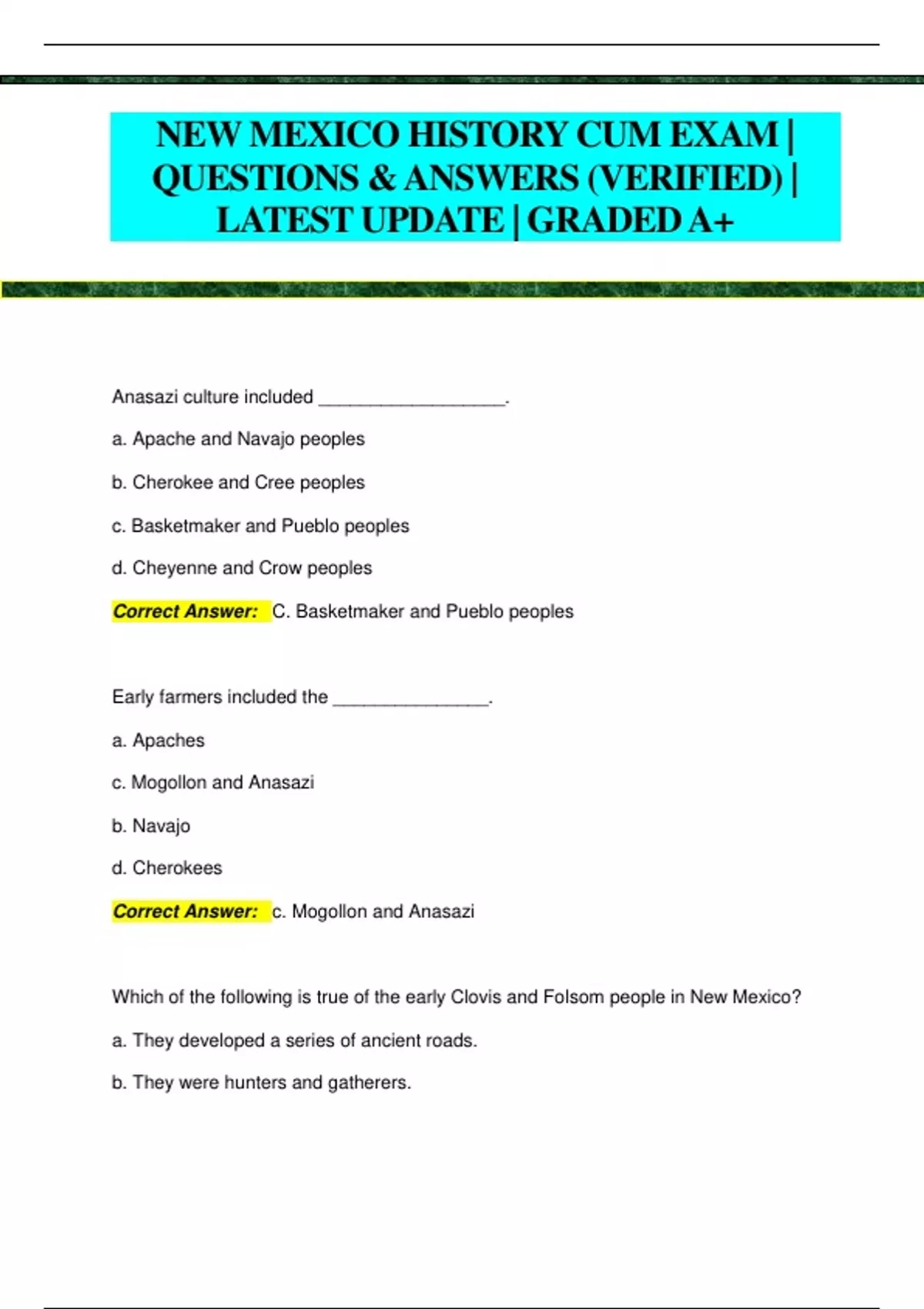 NEW MEXICO HISTORY CUM EXAM | QUESTIONS & ANSWERS (VERIFIED) | LATEST UPDATE | GRADED A+ Anasazi culture included __________________. a. Apache and Navajo peoples b. Cherokee and Cree peoples c. Basketmaker and Pueblo peoples d. Cheyenne and Crow peoples Correct Answer: C. Basketmaker and Pueblo peoples Early farmers included the _______________. a. Apaches c. Mogollon and Anasazi b. Navajo d. Cherokees Correct Answer: c. Mogollon and Anasazi Which of the following is true of the early Clovis and Folsom people in New Mexico? a. They developed a series of ancient roads. b. They were hunters and gatherers. c. They built multistoried houses from Adobe. d. They were primarily farmers. Correct Answer: B. They were hunters and gatherers