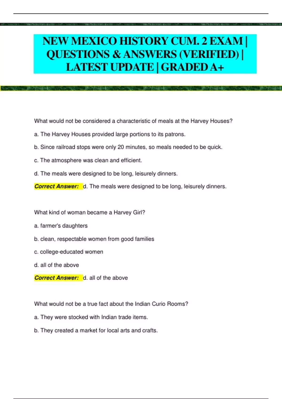 NEW MEXICO HISTORY CUM. 2 EXAM | QUESTIONS & ANSWERS (VERIFIED) | LATEST UPDATE | GRADED A+ What would not be considered a characteristic of meals at the Harvey Houses? a. The Harvey Houses provided large portions to its patrons. b. Since railroad stops were only 20 minutes, so meals needed to be quick. c. The atmosphere was clean and efficient. d. The meals were designed to be long, leisurely dinners. Correct Answer: d. The meals were designed to be long, leisurely dinners. What kind of woman became a Harvey Girl? a. farmer's daughters b. clean, respectable women from good families c. college-educated women d. all of the above Correct Answer: d. all of the above What would not be a true fact about the Indian Curio Rooms? a. They were stocked with Indian trade items. b. They created a market for local arts and crafts. c. They were located only in two of the Harvey Hotels. d. Mary Colter got her start creating displays for curio rooms. Correct Answer: c. They were located only in two of the Harvey Hotels. What were the characteristics of Mary Colter's architecture? a. She drew her inspiration from Frank Lloyd Wright. b. It imitated the style of European architects. c. Her architecture was similar to art later known as Art Deco. d. It combined the elements of cultural simplicity and harmony with the environment . Correct Answer: d. It combined the elements of cultural simplicity and harmony with the environment .