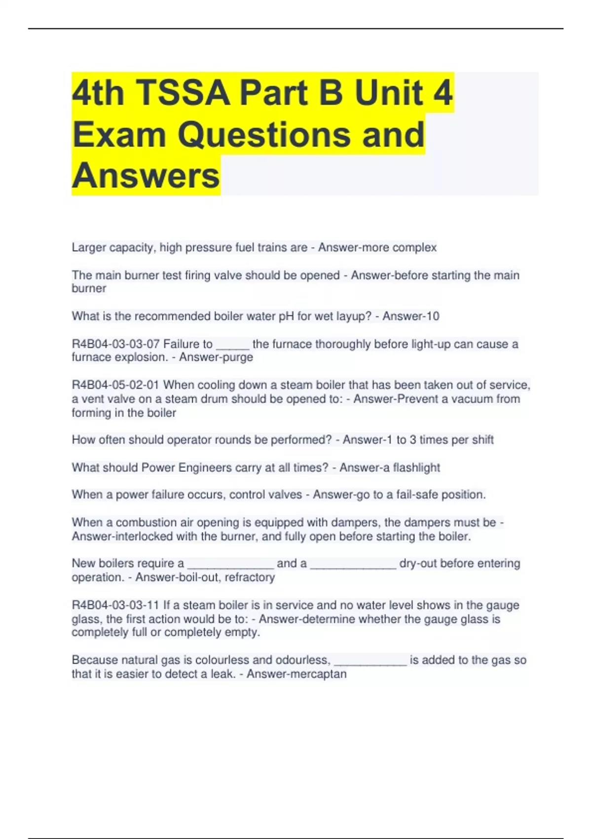 4th TSSA Part B Unit 4 Exam Questions and Answers Larger capacity, high pressure fuel trains are - Answer-more complex The main burner test firing valve should be opened - Answer-before starting the main burner What is the recommended boiler water pH for wet layup? - Answer-10 R4B Failure to _____ the furnace thoroughly before light-up can cause a furnace explosion. - Answer-purge R4B When cooling down a steam boiler that has been taken out of service, a vent valve on a steam drum should be opened to: - Answer-Prevent a vacuum from forming in the boiler How often should operator rounds be performed? - Answer-1 to 3 times per shift What should Power Engineers carry at all times? - Answer-a flashlight When a power failure occurs, control valves - Answer-go to a fail-safe position. When a combustion air opening is equipped with dampers, the dampers must be - Answer-interlocked with the burner, and fully open before starting the boiler. New boilers require a _____________ and a _____________ dry-out before entering operation. - Answer-boil-out, refractory R4B If a steam boiler is in service and no water level shows in the gauge glass, the first action would be to: - Answer-determine whether the gauge glass is completely full or completely empty. Because natural gas is colourless and odourless, ___________ is added to the gas so that it is easier to detect a leak. - Answer-mercaptan In a multiple boiler high pressure steam plant, when starting an entire system from cold - Answer-The entire system warms and pressurizes as one boiler warms, except for the boilers being left off line. On a semi-automatic ignition system, the switch on the supervised cock - Answer-keeps the boiler from pre-purging if the main test firing valve is open. Which code contains information on safety valves for high pressure steam boilers? - Answer-ASME Section I R4B New refractory in a boiler must be thoroughly dried on low fire - Answer-to dry the refractory slowly and keep it from cracking. What is the recommended test frequency for flame safeguard devices? - Answer-weekly If the safety relief valve of a hot water heating boiler is set to open at 207 kPa, the operating pressure should not exceed - Answer-138 kPa.