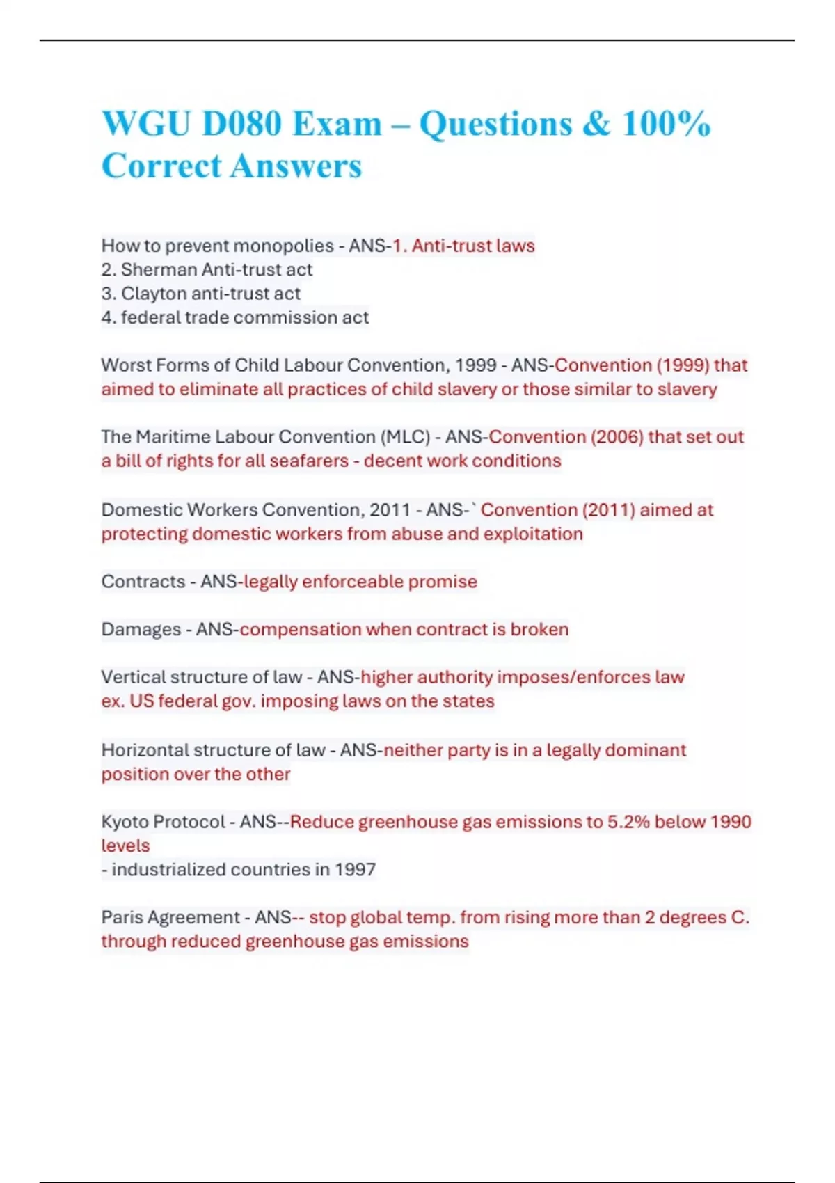 WGU D080 Exam – Questions & 100% Correct Answers How to prevent monopolies - ANS-1. Anti-trust laws 2. Sherman Anti-trust act 3. Clayton anti-trust act 4. federal trade commission act Worst Forms of Child Labour Convention, 1999 - ANS-Convention (1999) that aimed to eliminate all practices of child slavery or those similar to slavery The Maritime Labour Convention (MLC) - ANS-Convention (2006) that set out a bill of rights for all seafarers - decent work conditions Domestic Workers Convention, 2011 - ANS-`Convention (2011) aimed at protecting domestic workers from abuse and exploitation Contracts - ANS-legally enforceable promise Damages - ANS-compensation when contract is broken Vertical structure of law - ANS-higher authority imposes/enforces law ex. US federal gov. imposing laws on the states Horizontal structure of law - ANS-neither party is in a legally dominant position over the other Kyoto Protocol - ANS--Reduce greenhouse gas emissions to 5.2% below 1990 levels - industrialized countries in 1997 Paris Agreement - ANS-- stop global temp. from rising more than 2 degrees C. through reduced greenhouse gas emissions National Environmental Policy Act (NEPA) - ANS-required federal agencies to prepare environmental impact statements for every recommendation or report Environmental Protection Agency (EPA) - ANS-The US federal agency with a mission to protect human health and the environment. What is globalization? - ANS-When international integration arises from the interchange of world views, products, ideas, and other aspects of cultures. different types of Globalization - ANS-1. Economic 2. Political 3. Cultural Advantages of Economic globalization - ANS-more trade, investments, information technology, faster economic development, and increased social being Disadvantages of Economic globalization - ANS-benefits the rich at the expense of the poor, manufacturing job loss in developed countries, environmental damage, and unethical practices of labor Advantages of Political globalization - ANS-more cooperation amount countries, formation of international or regional organizations, NGOs Disadvantages of Political globalization - ANS-reduce the importance of nation-states, loss of sovereignty and power of local government Advantages of Cultural globalization - ANS-awareness of international community Disadvantages of Cultural globalization - ANS-loss of uniqueness of a country's culture What is international business? - ANS-any situation where the production or distribution of goods or services crosses country border