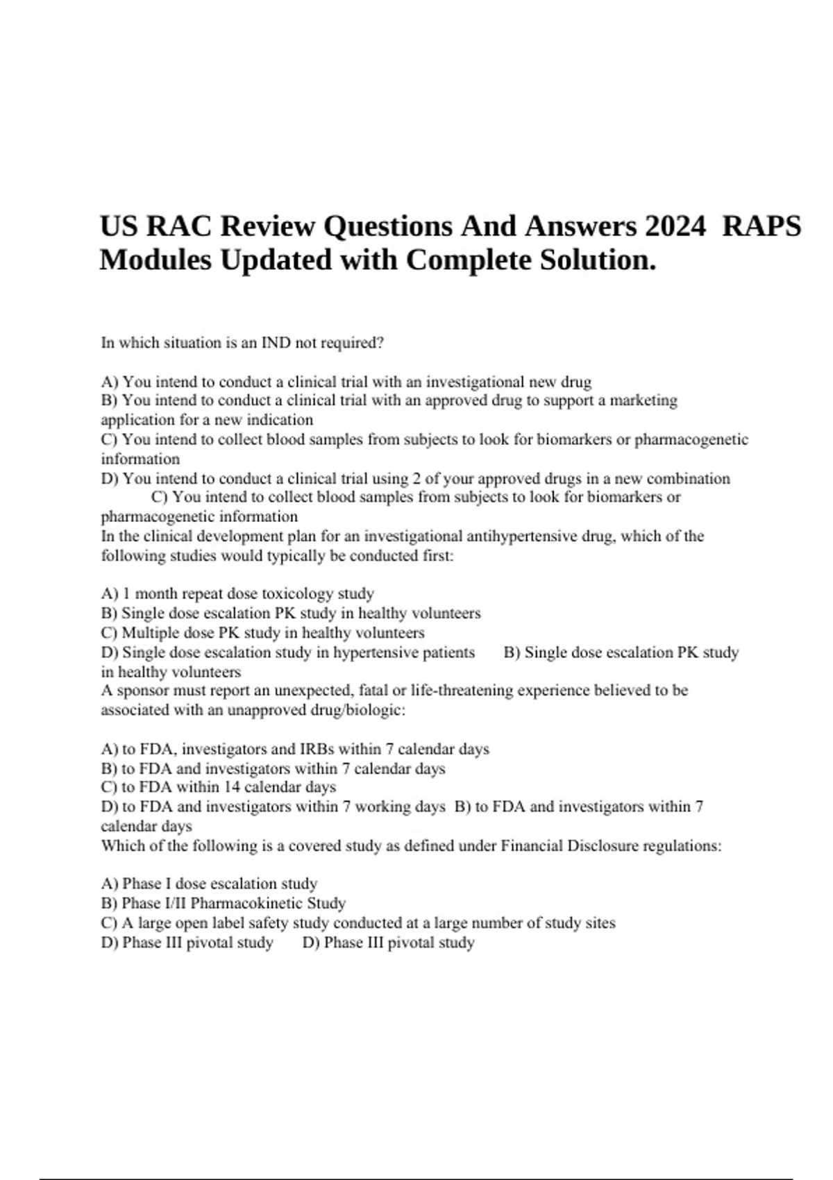 US RAC Review Questions And Answers 2024 RAPS Modules Updated with Complete Solution. In which situation is an IND not required? A) You intend to conduct a clinical trial with an investigational new drug B) You intend to conduct a clinical trial with an approved drug to support a marketing application for a new indication C) You intend to collect blood samples from subjects to look for biomarkers or pharmacogenetic information D) You intend to conduct a clinical trial using 2 of your approved drugs in a new combination C) You intend to collect blood samples from subjects to look for biomarkers or pharmacogenetic information In the clinical development plan for an investigational antihypertensive drug, which of the following studies would typically be conducted first: A) 1 month repeat dose toxicology study B) Single dose escalation PK study in healthy volunteers C) Multiple dose PK study in healthy volunteers D) Single dose escalation study in hypertensive patients B) Single dose escalation PK study in healthy volunteers A sponsor must report an unexpected, fatal or life-threatening experience believed to be associated with an unapproved drug/biologic: A) to FDA, investigators and IRBs within 7 calendar days B) to FDA and investigators within 7 calendar days C) to FDA within 14 calendar days D) to FDA and investigators within 7 working days B) to FDA and investigators within 7 calendar days Which of the following is a covered study as defined under Financial Disclosure regulations: A) Phase I dose escalation study B) Phase I/II Pharmacokinetic Study C) A large open label safety study conducted at a large number of study sites D) Phase III pivotal study D) Phase III pivotal study US RAC Review Questions And Answers 2024 RAPS Modules Updated with Complete Solution. Your company is developing a product to treat a serious and life threatening disease. A clinically meaningful, well established primary endpoint will be used in the pivotal studies. Which regulatory strategy might you select prior to commencing Phase 3 studies? A) Request Special Protocol Assessment B) Request Fast Track Designation C) Request Priority Review D) Approval under Subpart H, Accelerated Approval of New Drugs for Serious or Life Threatening Illnesses A) Request Special Protocol Assessment As a regulatory affairs professional, you are responsible for developing the content of an information package for a Type B meeting with FDA. Your primary objective is to: A) Reach consensus on content from contributing team members B) Ensure content is sufficient to support meeting objective(s) and questions to FDA C) Provide appropriate preclinical summary D) Provide appropriate clinical summary B) Ensure content is sufficient to support meeting objective(s) and questions to FDA You, a regulatory affairs professional, are assessing the information to be submitted in support of a marketing application for a new dosage form for a listed drug. You lack right of reference to one key preclinical report. Which type of application will you prepare for submission? A) 505 (b) (1) B) 505 (b) (2) C) 505 (j) D) PMA B) 505 (b) (2) 8) If FDA were to invoke the Application Integrity Policy, which of the following is a possible outcome? A) Defer review of pending application(s) B) "File" a marketing application at the 60 day review C) Grant a waiver or deferral for pediatric clinical study D) Approve a marketing application A) Defer review of pending application(s) 9) Which of the following supplements to an approved NDA/BLA must be approved by FDA prior to distributing product made using the change? A) Make change(s) to comply with USP B) Change in the technical grade of an excipient, same specifications and use C) Add a warning statement to prescribing information D) Process change outside the validated range D) Process change outside the validated range 10) Which of the following products would not be regulated by CDER? A) Therapeutic proteins B) Vaccines C) Chemically synthesized small molecules D) Monoclonal antibodies B) Vaccines 11) Which of the following devices would be regulated by CBER? A) Warming device B) Blood pressure cuff C) HIV diagnostic test kit D) Capillary blood collection tube C) HIV diagnostic test kit 12) You are developing a combination product and believe the primary mode of action will designate the product as a drug as opposed to a device. Your first course of action is to: A) Develop written rationale describing the product, mode(s) of action, and proposed classification as a drug B) Submit a formal request for designation to the Office of Combination Products C) Call the CDER review division D) Check the FDA website for information, eg, other combination/similar products D) Check the FDA website for information, eg, other combination/similar products 13) For a medical Device, what is NOT a responsibility of the US Agent for a Foreign Establishment? A) Report adverse events under the Medical Device Reporting regulation B) Assisting FDA in communications with the foreign establishment, C) Responding to questions concerning the foreign establishment's products that are imported or offered for import into the United States, and D) Assisting FDA in scheduling inspections of the foreign establishment. A) Report adverse events under the Medical Device Reporting regulation 14) Which Congressional Act provided Statutory Authority to FDA to regulate medical devices? A) Safe Medical Devices Act of 1990 (SMDA) B) Medical Device User Fee and Modernization Act of 2002 (MDUFMA) C) Federal Food, Drug, Cosmetic Act (FDC Act) D) Medical Device Amendments of 1976 (MDA) D) Medical Device Amendments of 1976 (MDA) 15) Which of the following is NOT a key Medical Device submission which directly leads to marketing permission from FDA? A) 510(k), Pre-market Notification, Part 807 B) HDE, Humanitarian Device Exemption, Part 814 C) Premarket Approval (PMA), Part 814 D) IDE, Investigational Device Exemptions, Part 812 D) IDE, Investigational De