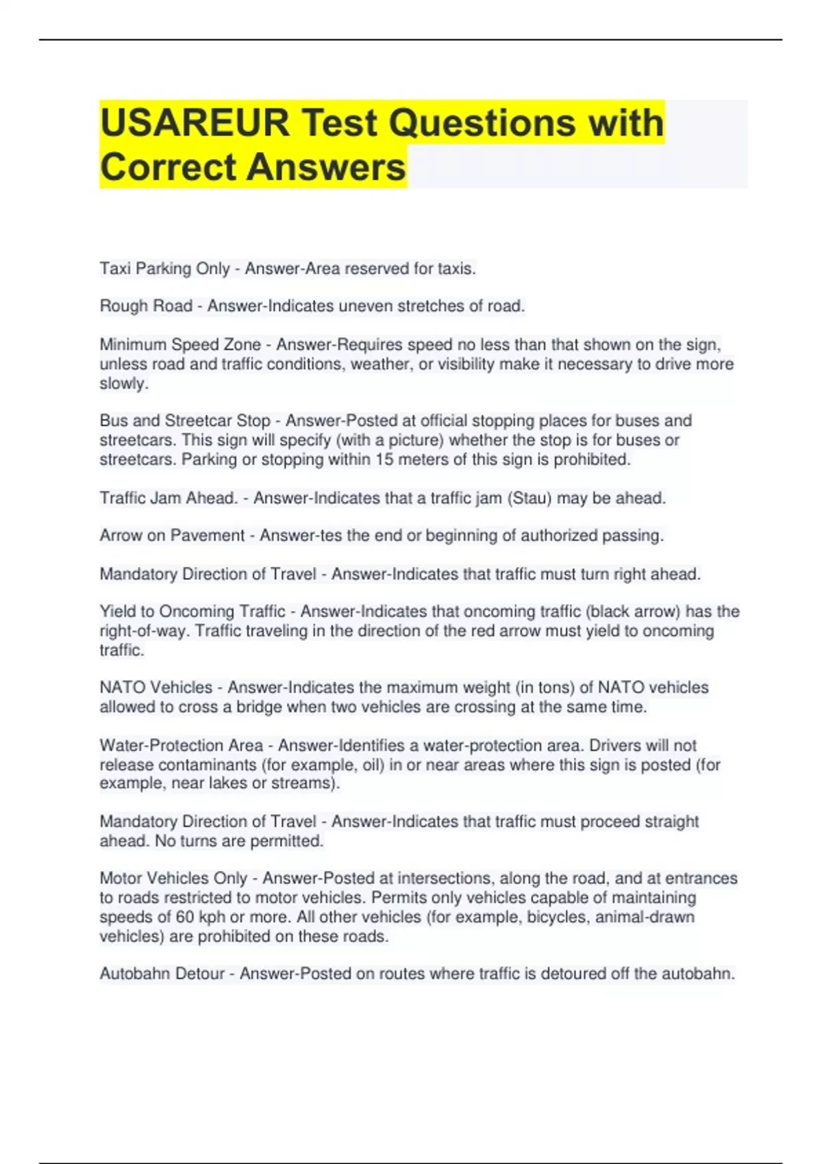 USAREUR Test Questions with Correct Answers Taxi Parking Only - Answer-Area reserved for taxis. Rough Road - Answer-Indicates uneven stretches of road. Minimum Speed Zone - Answer-Requires speed no less than that shown on the sign, unless road and traffic conditions, weather, or visibility make it necessary to drive more slowly. Bus and Streetcar Stop - Answer-Posted at official stopping places for buses and streetcars. This sign will specify (with a picture) whether the stop is for buses or streetcars. Parking or stopping within 15 meters of this sign is prohibited. Traffic Jam Ahead. - Answer-Indicates that a traffic jam (Stau) may be ahead. Arrow on Pavement - Answer-tes the end or beginning of authorized passing. Mandatory Direction of Travel - Answer-Indicates that traffic must turn right ahead. Yield to Oncoming Traffic - Answer-Indicates that oncoming traffic (black arrow) has the right-of-way. Traffic traveling in the direction of the red arrow must yield to oncoming traffic. NATO Vehicles - Answer-Indicates the maximum weight (in tons) of NATO vehicles allowed to cross a bridge when two vehicles are crossing at the same time.