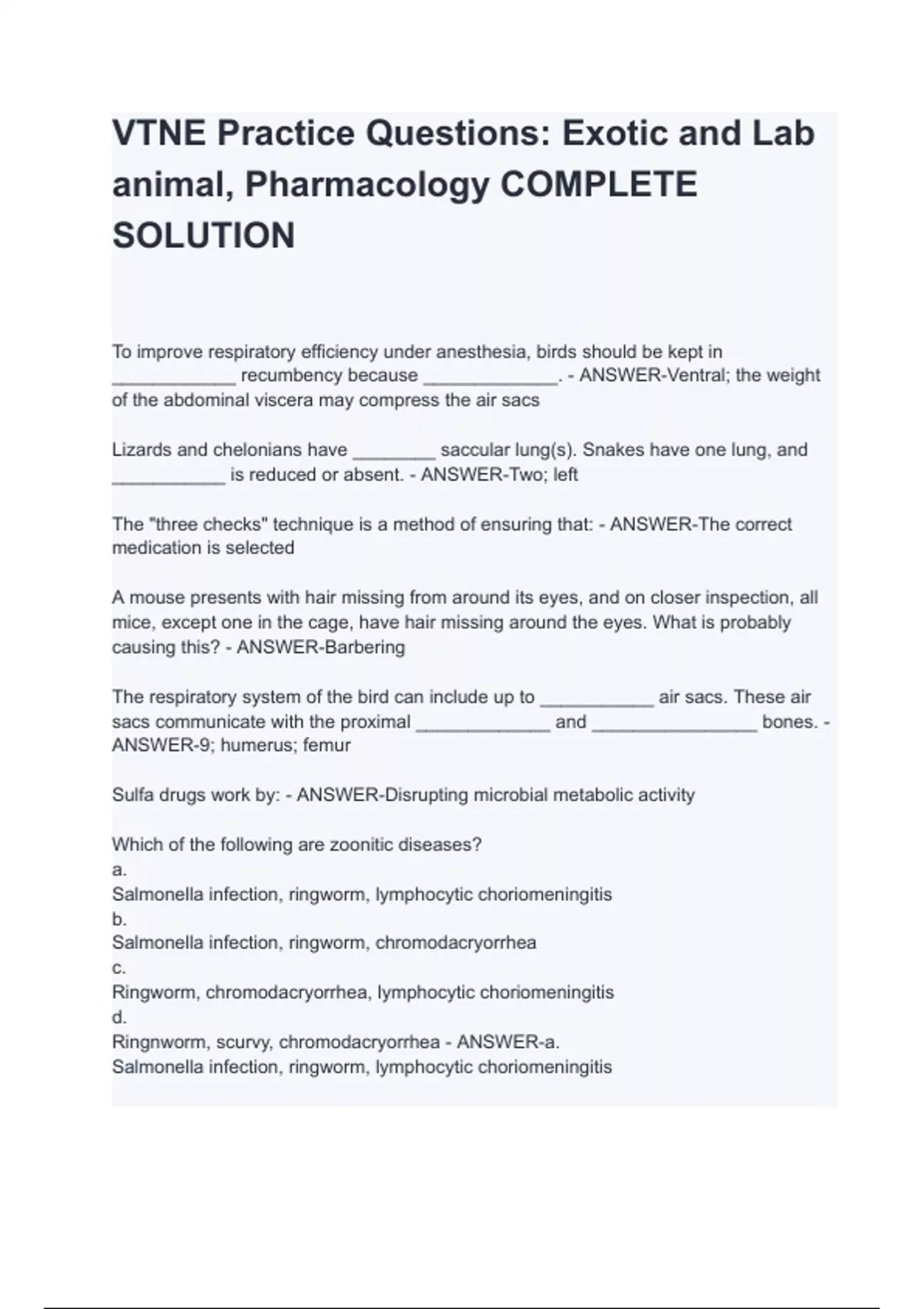 VTNE Practice Questions: Exotic and Lab animal, Pharmacology COMPLETE SOLUTION
