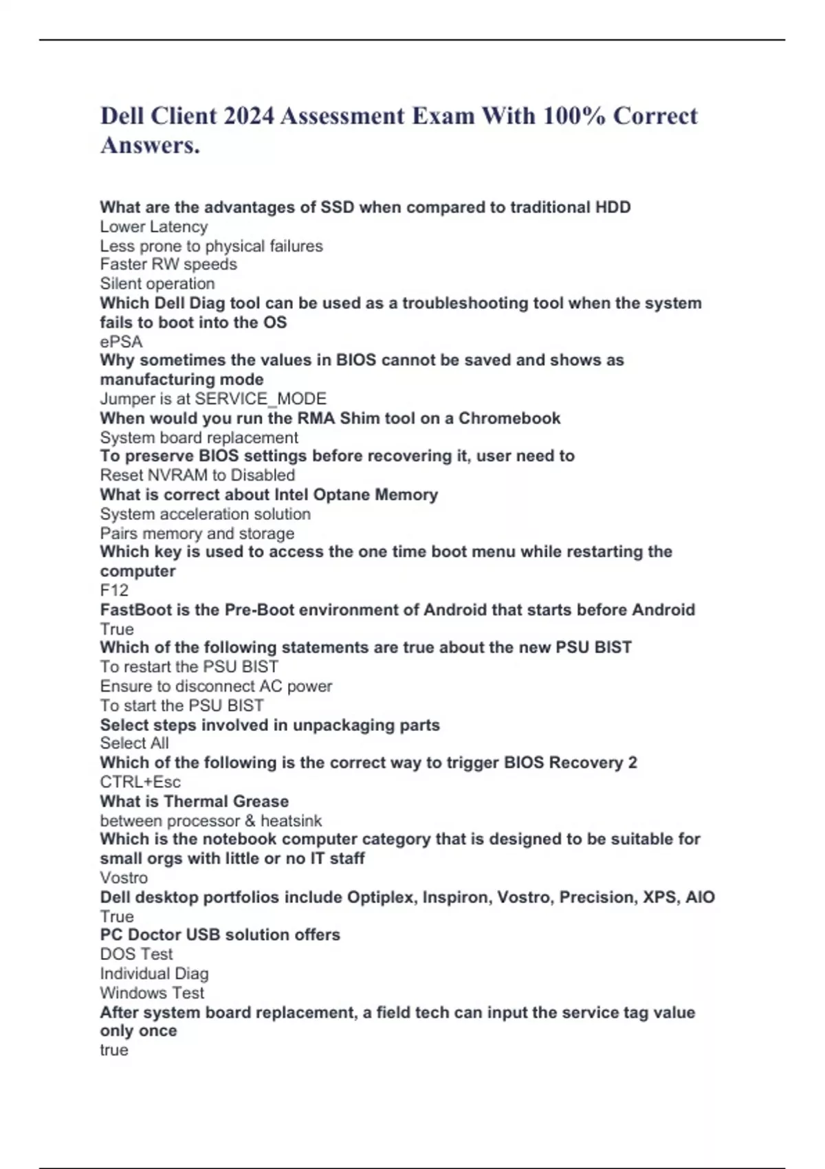 Dell Client 2024 Assessment Exam With 100% Correct Answers. What are the advantages of SSD when compared to traditional HDD Lower Latency Less prone to physical failures Faster RW speeds Silent operation Which Dell Diag tool can be used as a troubleshooting tool when the system fails to boot into the OS ePSA Why sometimes the values in BIOS cannot be saved and shows as manufacturing mode Jumper is at SERVICE_MODE When would you run the RMA Shim tool on a Chromebook System board replacement To preserve BIOS settings before recovering it, user need to Reset NVRAM to Disabled What is correct about Intel Optane Memory System acceleration solution Pairs memory and storage Which key is used to access the one time boot menu while restarting the computer F12 FastBoot is the Pre-Boot environment of Android that starts before Android True Which of the following statements are true about the new PSU BIST To restart the PSU BIST Ensure to disconnect AC power To start the PSU BIST Select steps involved in unpackaging parts Select All Which of the following is the correct way to trigger BIOS Recovery 2 CTRL+Esc What is Thermal Grease between processor & heatsink Which is the notebook computer category that is designed to be suitable for small orgs with little or no IT staff Vostro Dell desktop portfolios include Optiplex, Inspiron, Vostro, Precision, XPS, AIO True PC Doctor USB solution offers DOS Test Individual Diag Windows Test After system board replacement, a field tech can input the service tag value only once