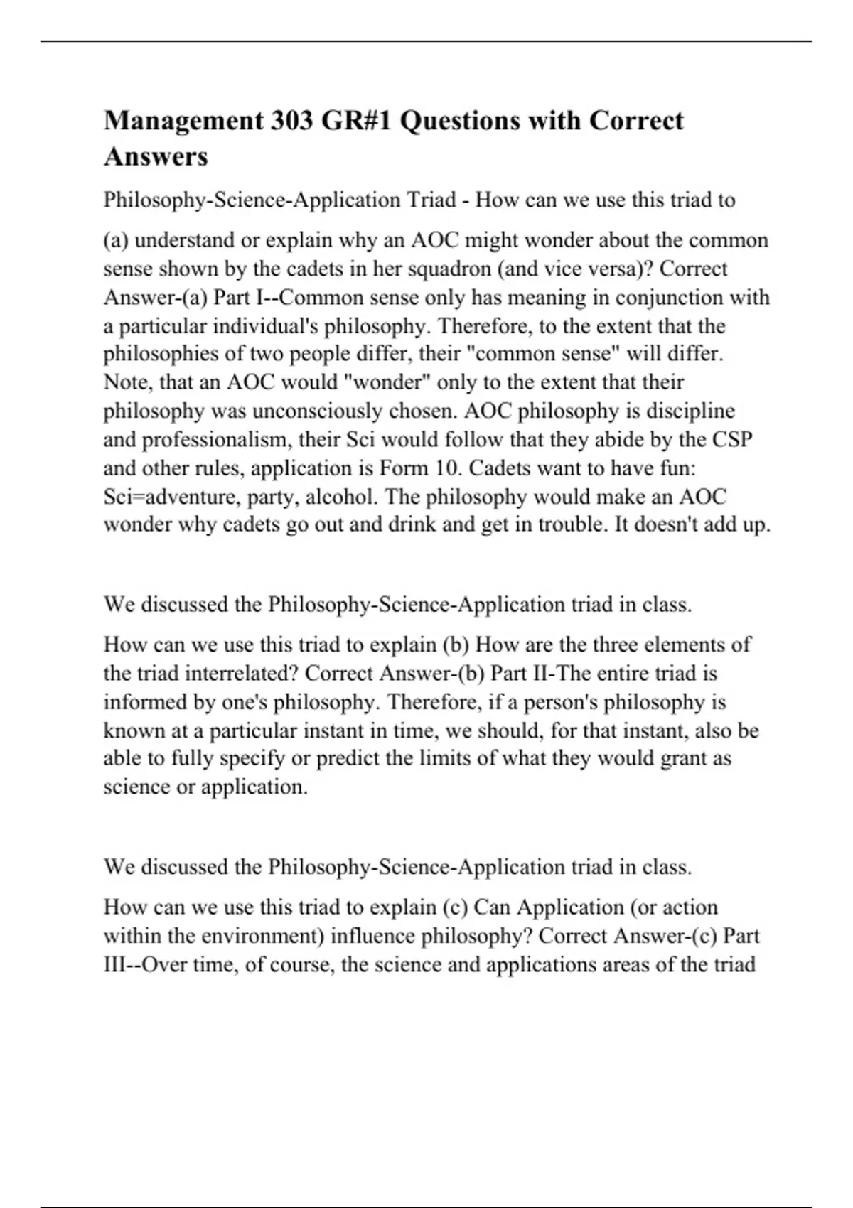 Philosophy-Science-Application Triad - How can we use this triad to (a) understand or explain why an AOC might wonder about the common sense shown by the cadets in her squadron (and vice versa)? Correct Answer-(a) Part I--Common sense only has meaning in conjunction with a particular individual's philosophy. Therefore, to the extent that the philosophies of two people differ, their "common sense" will differ. Note, that an AOC would "wonder" only to the extent that their philosophy was unconsciously chosen. AOC philosophy is discipline and professionalism, their Sci would follow that they abide by the CSP and other rules, application is Form 10. Cadets want to have fun: Sci=adventure, party, alcohol. The philosophy would make an AOC wonder why cadets go out and drink and get in trouble. It doesn't add up. We discussed the Philosophy-Science-Application triad in class. How can we use this triad to explain (b) How are the three elements of the triad interrelated? Correct Answer-(b) Part II-The entire triad is informed by one's philosophy. Therefore, if a person's philosophy is known at a particular instant in time, we should, for that instant, also be able to fully specify or predict the limits of what they would grant as science or application. We discussed the Philosophy-Science-Application triad in class. How can we use this triad to explain (c) Can Application (or action within the environment) influence philosophy? Correct Answer-(c) Part III--Over time, of course, the science a